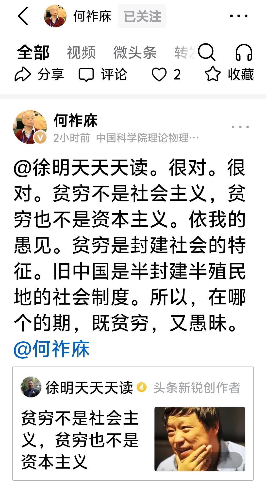 何祚庥的贫穷与社会制度理论很扯淡 政工院士何祚庥偌大年纪,发帖不辍,为了宣扬他的主张,其坚韧不拔之精神真是可歌可泣。 这不,老何看了一个叫“徐明天天读”的帖子后,又思如泉涌,发了一条读后感∶“贫穷不是社会主义,贫穷也不是资本主义。依我的愚见。贫穷是封建社会的特征。旧中国是半封建半殖民地的社会制度。所以,在哪个的期,既贫穷,又愚昧。”以贫穷与否作为社会制度的评价标准,显然,政工院士的政工专业太有失水准。 按老何的理论,中国2020年底才宣布全面脱贫,那么,1949年10月-2020年11月这几十年,中国不是社会主义。美国的斩杀线触目惊心,满大街流浪汉,美国建国250年来都不是资本主义。 老何这理论,不是荒谬至极吗?