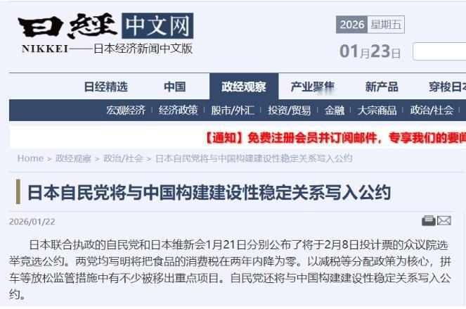 日本自民党这是要抛弃“高市早苗”?“当地时间1月21日,日本自民党在众议院选举公约中罕见写入“与中国构建建设性、稳定的双边关系”。 高市2025年10月刚上台,就抱着安倍的“遗志”疯狂对华挑事,张口闭口“台湾有事就是日本有事”,本以为自民党会一路跟着硬刚,没成想选举公约直接给她泼了盆冷水,这明摆着是要和她的激进路线切割。 自民党可没那么好心,突然软化对华态度纯是被逼的,高市的强硬操作让日本经济遭了重,咱们的稀土出口管制,直接卡了日本半导体产业的脖子,相关企业哀嚎一片,损失超两万亿日元。 不光是产业受创,旅游业、渔业也跟着遭殃,赴日中国游客锐减近四成,靠旅游吃饭的地方直接没了营收。水产品进口暂停后,日本渔业重镇更是陷入瘫痪,从业者怨声载道。 经济账算不清,选票就没着落,自民党心里门儿清,高市那套激进言论只能骗骗右翼,普通民众更关心钱包,民调显示超六成日本人觉得该优先搞经济,不是对外挑事。 党内矛盾也快压不住了,麻生派当初帮高市上台,转头就对她的独断决策不满,石破茂等温和派更是公开拆台,直言“没和中国的关系,日本根本撑不下去”,派系裂痕越来越大。 雪上加霜的是,执政盟友公明党直接撂挑子,退出联盟后和在野党抱团,这一下抽走了自民党不少票仓,模拟推演显示,自民党可能要丢七十多席,大选形势岌岌可危。 有人可能觉得自民党是真心想改善对华关系,别太天真,公约里一边说要稳定关系,一边还提扩充防卫预算、放宽武器出口,典型的“又想赚钱又想挑事”。 这就是日本政客的套路,经济靠中国、安全靠美国,想两头占便宜,经团联早就给自民党施压,不许为了政治冒险牺牲经济利益,毕竟中国是日本最大贸易伙伴,依赖度超七成。 美国那边也靠不住,嘴上喊着支持日本,真到关键时候就玩“战略模糊”,高市想绑着美国抗中,结果人家连供应链问题都不肯背书,说白了就是把日本当棋子。 咱们国家也不会被几句空话忽悠,之前就明确表态,要求日方恪守一个中国原则,稀土管制就是最好的警告,光靠选举公约喊口号,没有实质行动,中日关系好不了。 自民党的转向,本质是给高市的激进路线止损,不管大选结果如何,日本右倾化的惯性改不了,只是换种方式和咱们周旋,这种投机取巧的把戏,迟早会自食恶果。 国家之间的相处,靠的是互相尊重不是两面三刀,日本要是真懂道理,就该摒弃冷战思维,踏踏实实和咱们合作,否则再怎么折腾,也改变不了实力对比的现实。 政客的嘴,骗人的鬼,自民党这番操作说到底是为了选票,高市不过是他们随时能抛弃的棋子,唯有自身实力够硬,才能让对方不敢随意挑衅,这才是最实在的道理。 大家对此有什么看法呢?欢迎各位在评论区留言!