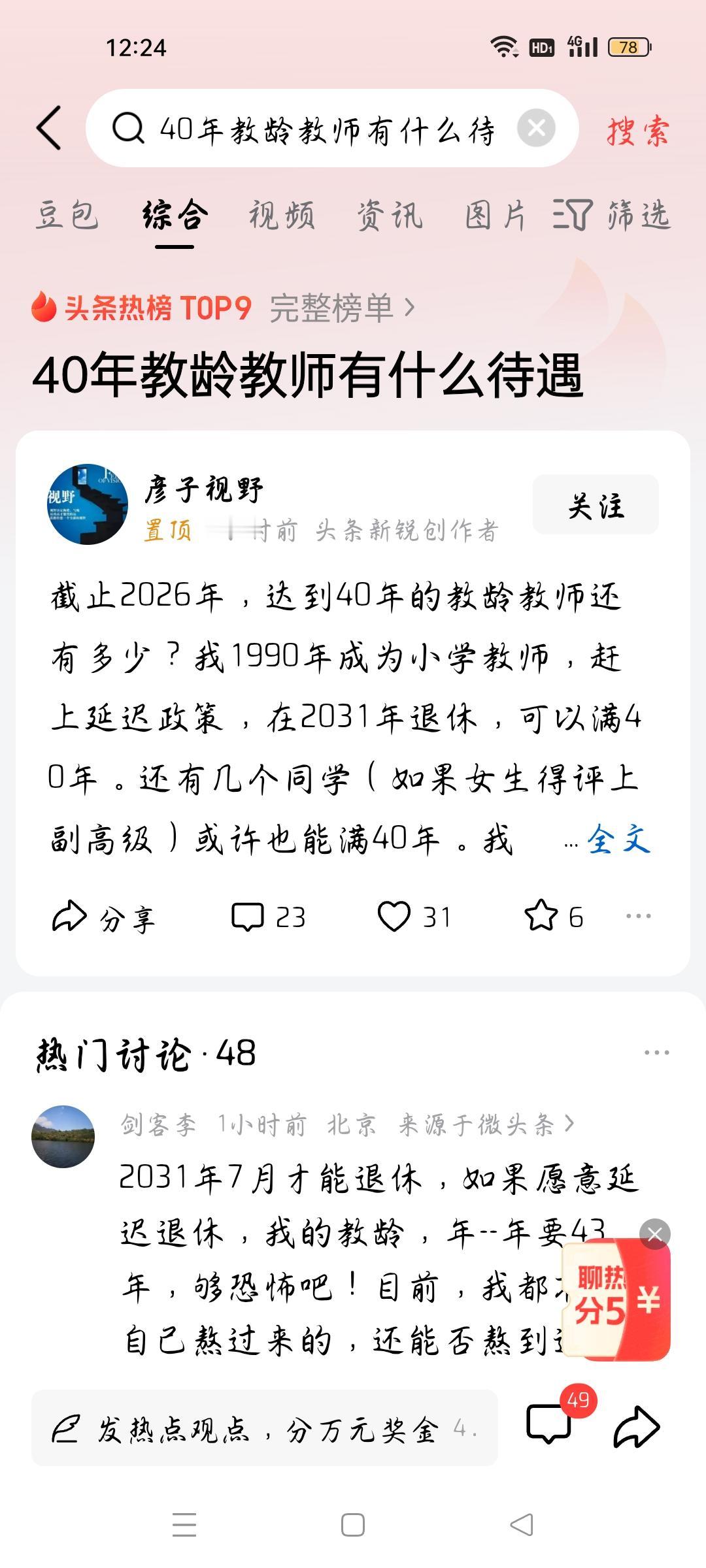 40年教龄有什么待遇? 关于这一话题的讨论,个人认为,目前为止,大多数20世纪八九年代参加工作的小学教师或中学教师有可能达到40年教龄,而21世纪参加工作的,大多数是本科,本科毕业22~23岁,现在是延长退休,男的可能接近40年,而女的就困难了,女的要延迟5年,必须是高级职称。至于40年教龄有什么待遇?个人认为,不就是养老金多得一些钱,多劳多得。各位条友觉得呢?