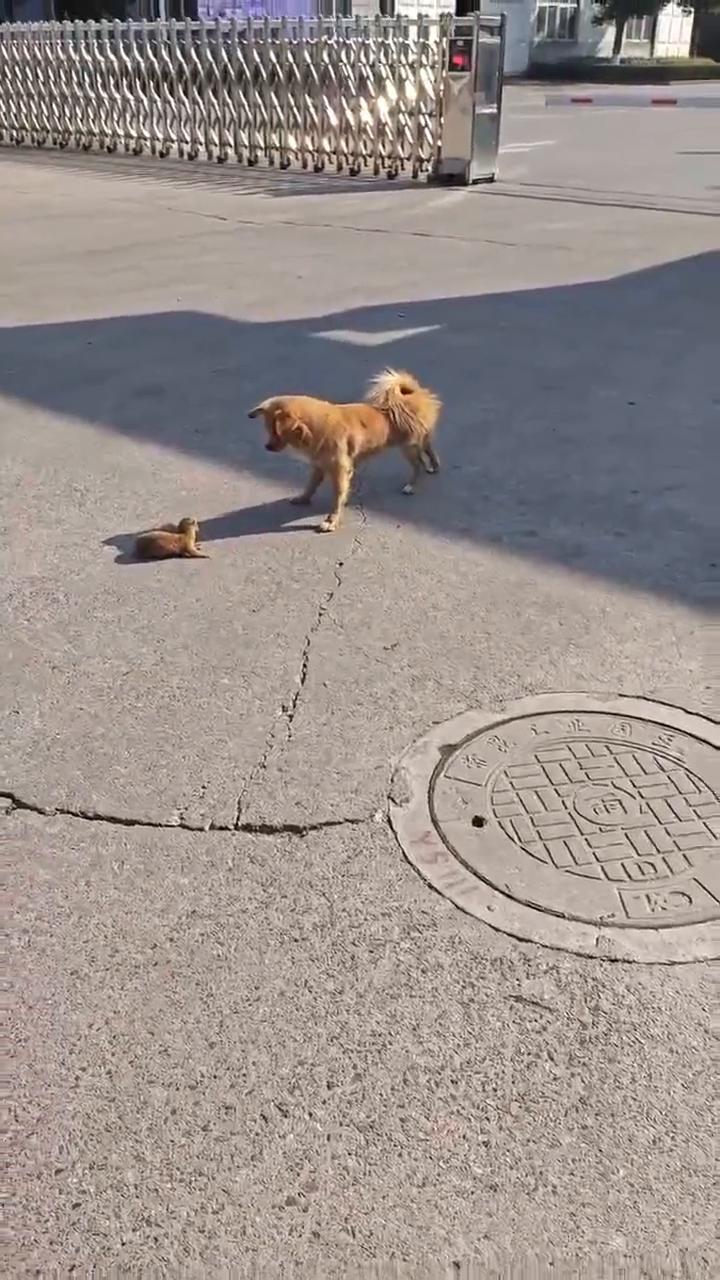 笑不活了!山东两只大狗带着小狗在路上散步,一名女子看狗爸爸跑远了,于是就上前去逗
