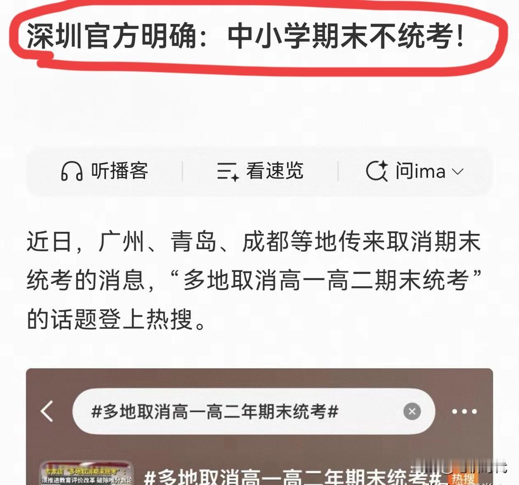 掩耳盗铃吗?多地通知取消期末统考!干掉尺子,长度就取消了吗?让考试承担所有,背后那根“指挥棒”停了吗? 如果是为减轻学习压力,更应该取消校外补课。其实一点也不影响卷,反而更卷了。 家长认为不考试不测验不拿分数说话,家长如何知道孩子的学习情况。中考高考瞬间拿分数说话,不是开盲盒吗? 要是不用分数呈现,学校自主组织评价,只分等级,有可能85以上和90以上甚至100分都划入一个等级里。根本难以区分成绩好坏。取消统考只会让孩子们的学习变得迷茫! 取消统考缺了区域统一参照,难判断自身水平在哪个段位。尤其是资源薄弱学校的学生缺有效诊断与指导。 而且现在都在花钱补课,有些家长又会去补课班考试测试。 考试没有错,统考没有错,分数也没有错,错的是人的态度和观念! 许多学生一年到头几乎都是在学习中度过,压力能不大吗?寒假很快来到了,还是琢磨该怎么取消校外补课来得实际。