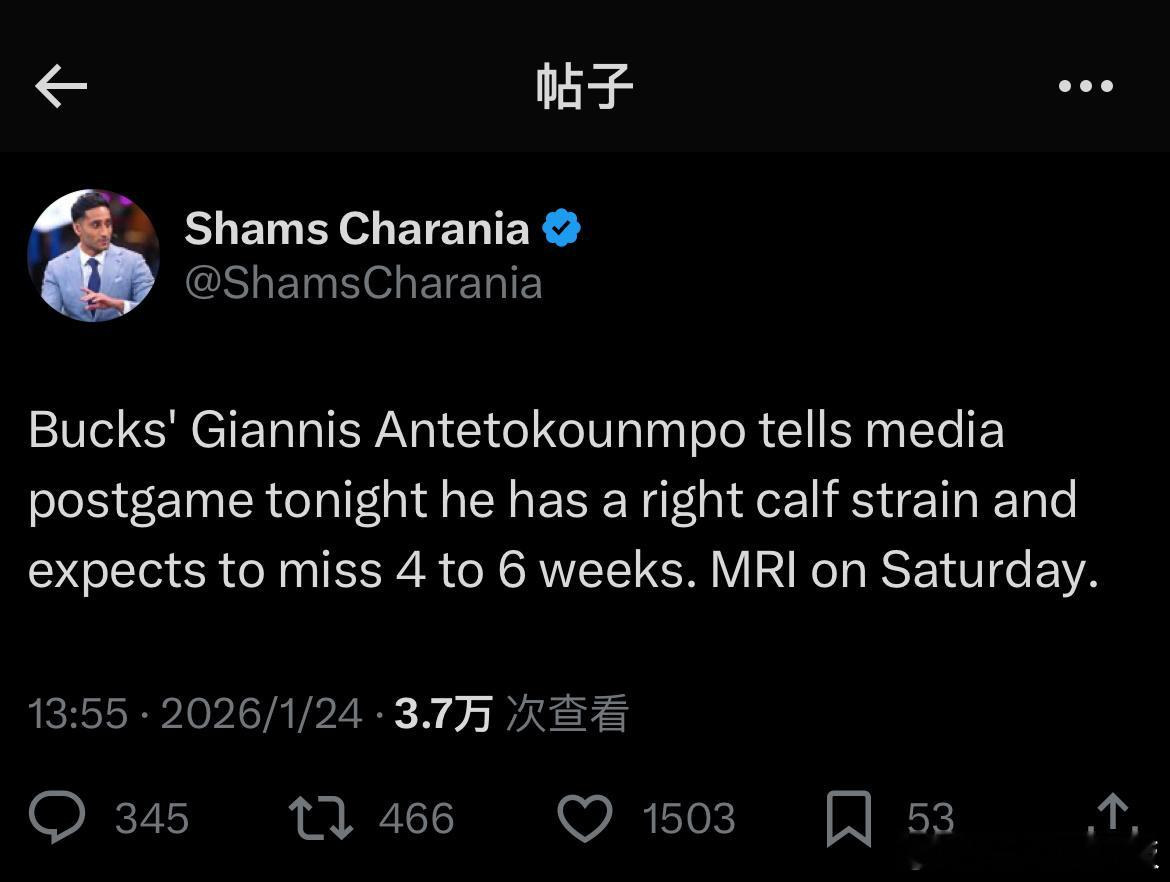 Shams:字母哥赛后告诉媒体,他右小腿拉伤,预计将缺席4-6周。他将于周日接受核磁共振检查。 字母哥预计缺席四到六周