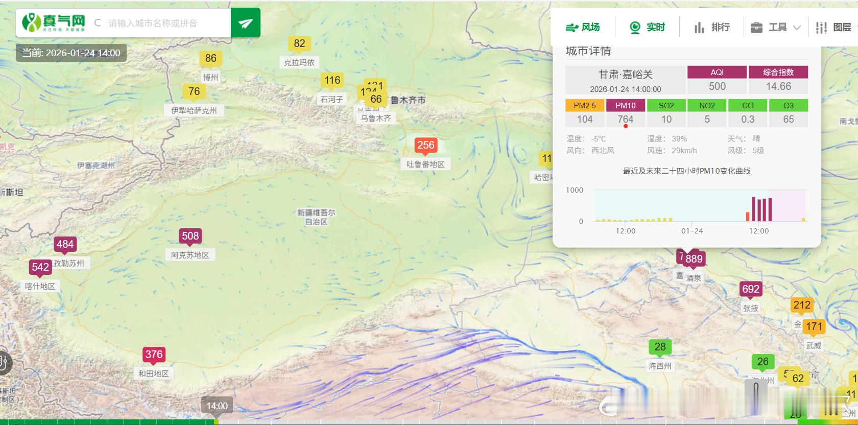 【霾和沙尘】今天白天,陕西关中、河南、河北南部、山东西部等地,污染发展加重,对应有霾。此外今天午后,除了塔里木盆地的沙尘污染继续,甘肃西部的嘉峪关、酒泉、张掖,PM10爆表,对应也有沙尘影响。未来甘肃西部的沙尘会继续东移。华北平原的霾先向北伸展,明天冷空气到来后再向南转移。