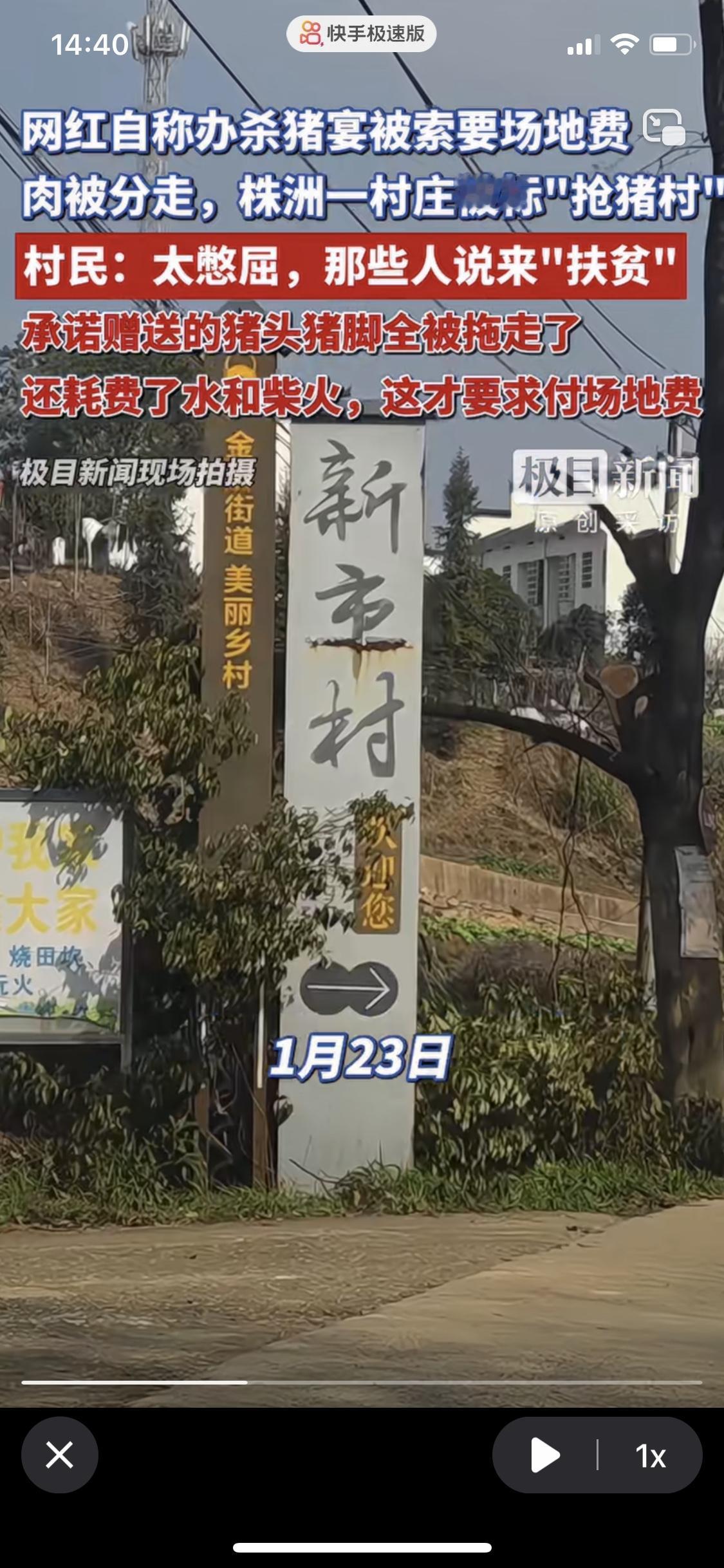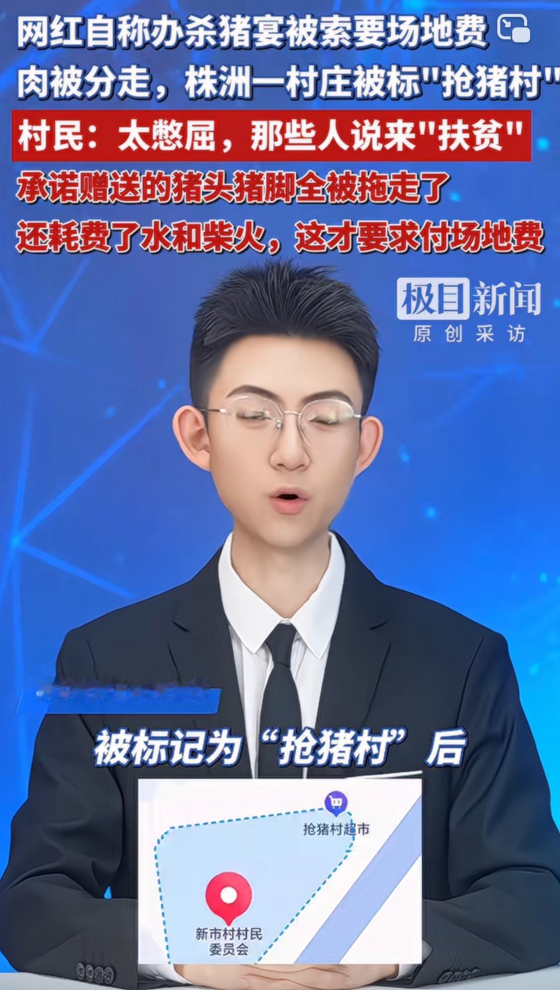 一场网红跟风办的“杀猪宴”,结果演变成一地鸡毛,双方都很委屈,何苦呢 1月17日,有900多万粉丝的大网红跟风在湖南省株洲市新市村办杀猪宴,结果杀猪宴最终因组织沟通问题没办成。 事后,因组织者的公开吐槽当时被屋主“反悔”索要场地费且部分猪肉被拿走,该村被恶意在地图上标注成了“抢猪村”。 这件事的主要争议点无非是“场地费”和“抢猪肉”。 网红团队:自费买猪,计划邀请村里独居老人免费吃饭,事先也与场地主人达成了免费提供场地的沟通。结果,不光被突然索要2000元场地费(后谈成1200元),导致“杀猪宴”没办成,肉还被拿走了; 村委会:活动未向村里和街道报备,受邀老人也并非都是独居老人。组织方声称宴席办不成了,让村民分肉,村民这才分的,且分走的猪肉不到一半,大部分被组织方拉走。但网红发布的相关视频对村庄声誉造成严重影响,已报警处理; 屋主:对方以“扶贫”名义找来,承诺赠送猪头、猪脚等作为场地使用报酬。但这些物品最终被全部拖走,因对方“失信”且消耗了自家的水、柴火,才要求支付费用。 如今,无论是新市村村委和场地主人,还是网红团队在网上都很委屈。最终,这件事以村庄被网暴、网红删除视频、官方介入调查收场。 评一下:具体真相如何不好评价,既然官方已下场,不妨耐心等待官方调查结果。但作为大网红,显然在此事上拥有绝对的舆论主导权,这也导致了“抢猪村”的出现。网红想的是“流量经济”,乡村考虑的是“人情世故”,双方要完美融合,显然仅靠简单沟通是完成不了的。 因此,本来对双方都是有利的事情却演变成如此一地鸡毛,多少有点丢大人了!