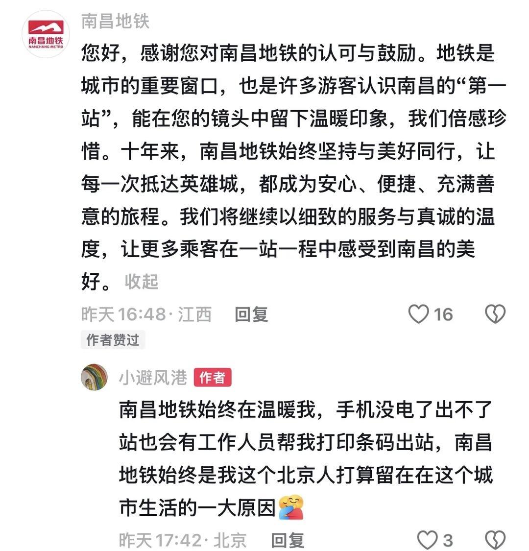 ✨被南昌地铁暖到了!谁说这不是顶级浪漫啊 姐妹们!最近刷到好多关于南昌地铁的帖子,真的破防了😭 一个在北京生活了四年的小姐姐@小避风塘发文说: "在南昌生活,真的很幸福!南昌地铁,每次都会带给我惊喜" ,结果收获1600+点赞,近400条评论!这不就是我每天经历的日常吗!幸福感瞬间拉满💕 📍看看南昌地铁到底有多「卷」! 🧸冬季候车座椅悄悄穿上"毛衣" 冷天等车屁股不凉啦~站台座椅换上了毛绒垫,这个细节谁懂啊! 🧳高铁站下车免费行李寄存 拖着大包小包等朋友来接?南昌地铁贴心提供免费寄存服务,空手逛gai不是梦! 🎨4号线安丰站美成艺术品 青花瓷主题设计直接把外国小姐姐美到尖叫!连古巴驻华大使馆、中国驻大阪总领事都来点赞,这排面绝了! 🚇大客流"神操作" 今年跨年夜末班车延到凌晨2点!平时还搞"分段布车+空车直达",最小间隔118秒,应急能力MAX! 🆓连续三年夏夜免费乘车 纳凉天堂不是吹的!南昌地铁:来了就是自家孩子,别客气! 💗这些小事,真的戳到心窝了 急着上班的工作人员看到提重物的乘客,还是会主动上前帮忙👍 乘客和家人走散了?广播找人、调监控,全程陪同绝不敷衍 身体不适?工作人员全程守护,比男朋友还靠谱 丢东西了?别说钱包手机,哪怕是一把扇子都会认真对待 🌟从2015到2025,十年如一日 从首条线路开通到现在,南昌地铁不只是拉近了城市距离,更是拉近了人心的距离。从标准化到个性化,从功能服务到情感连接... "你们让我感受到了家的温暖" 这大概就是最高的赞誉了吧! 南昌地铁用实际行动告诉我们:城市的温度,就藏在这些细节里❤️ 地铁 南昌地铁英雄城