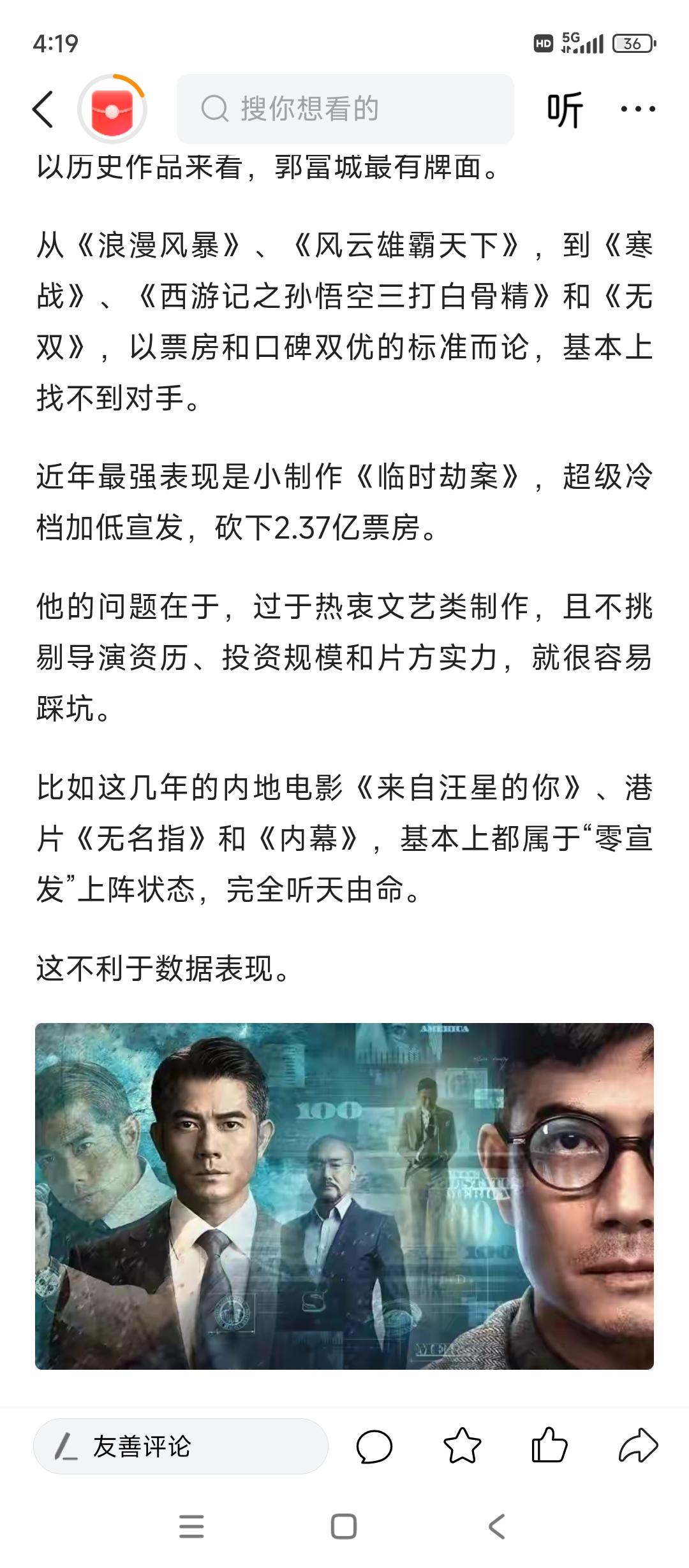 @唐泪 250是收了多少钱 整天没完没了的吹 你不觉得想吐吗[捂脸][捂脸][捂脸] 《内幕》《无名指》《来自旺星的你》等等都扑街到太空了,50万票房,现在居然说没宣传,有没有宣传你不知道??? 香港到处宣传,一定就要来内地吗? 现在网络时代,信息时代 什么叫你偶像郭富城热衷文艺片,小投资,新导演????张艺谋,冯小刚等大导演看得上你偶像郭富城吗? 60岁了,演技就这样,号召力没有,为啥要找你偶像呢?大片,你觉得大片投资人同你一样傻呢