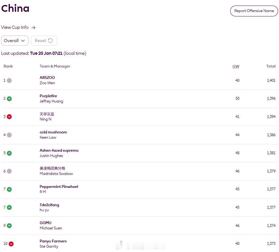 调FPL阵容的时候发现中国区第一名官方统计是大陆的阿森纳球迷,但实际上的第一是个台湾的利物浦玩家,类似情况还有香港的玩家以及用别的国家/地区身份加入国内联赛的玩家,台湾这哥们有点厉害啊。