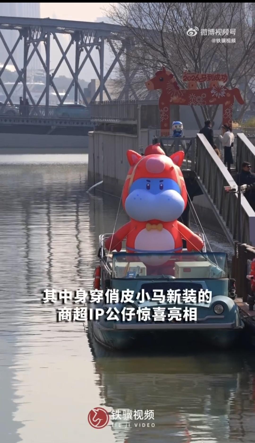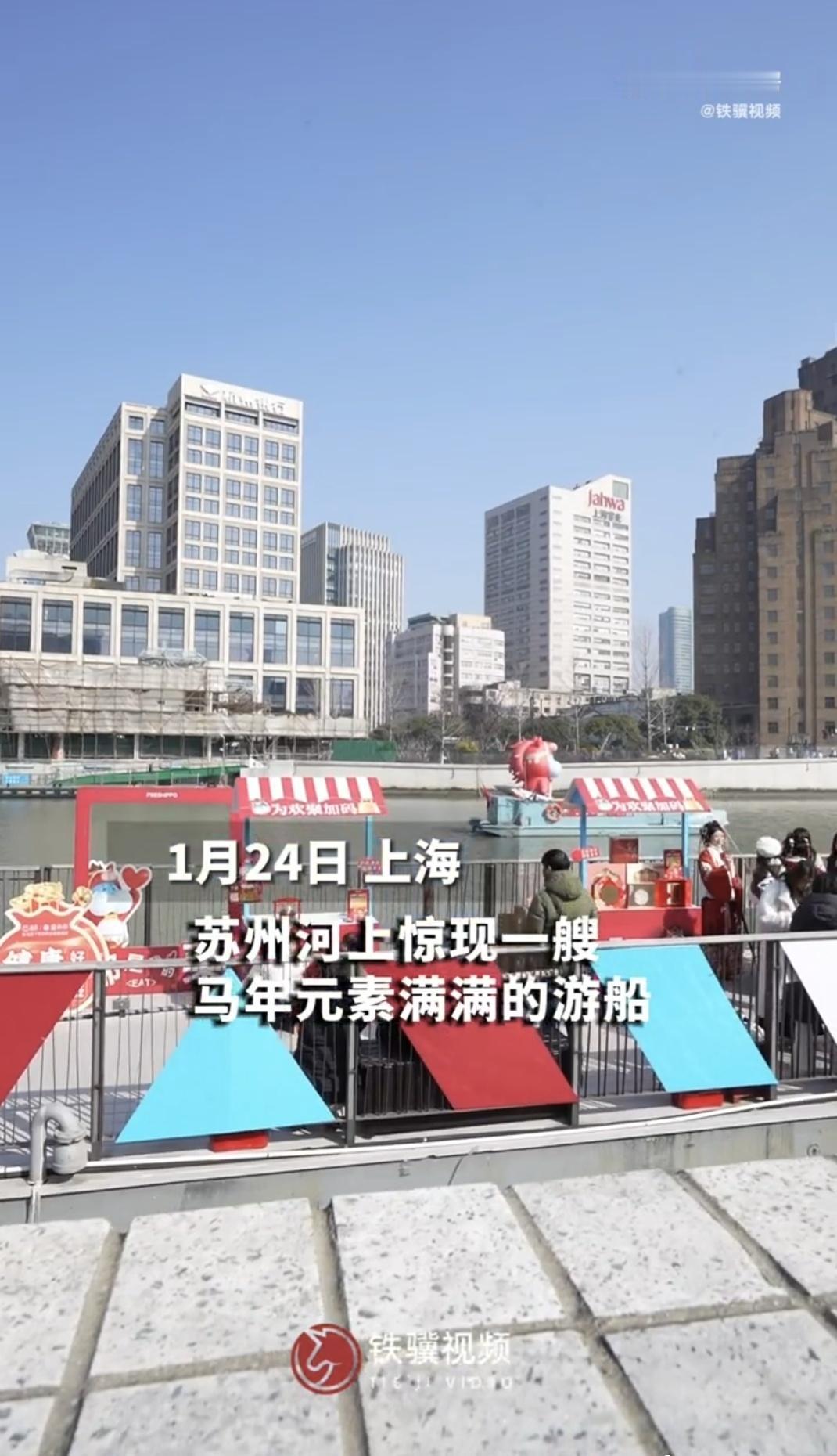 上海苏州河惊现巨型马年公仔苏州河的水波里,映出了一只穿新衣的巨大小马。它乘着游船,悠悠划过城市的心脉,所到之处,皆染上暖融融的春意。岸上的人们停下脚步,收藏下这马年最初的惊喜上海苏州河马年浓度拉满