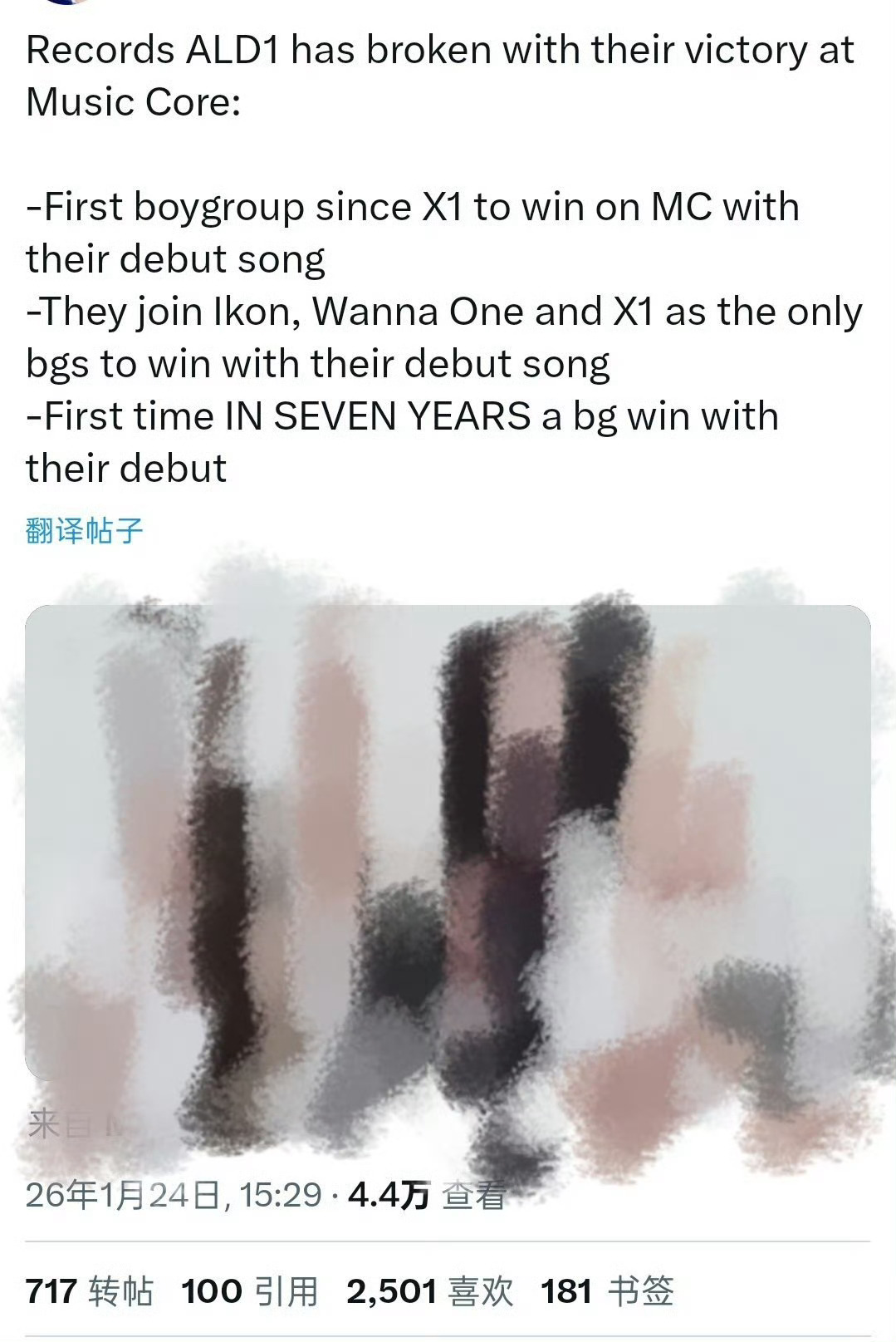 ALD1凭音乐中心夺冠创下的纪录:继X1后,首个以出道曲拿下音乐中心一位的男团。与IKON、Wanna One、X1并肩,成为仅有的几支以出道曲夺冠的男团。时隔七年,再次有男团以出道曲拿下该舞台一位 。