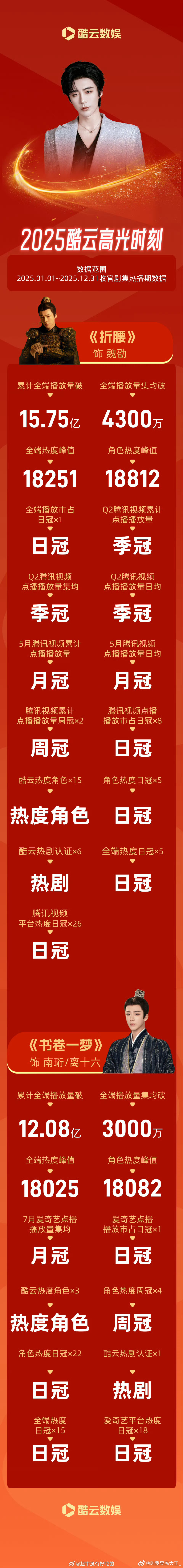 刘宇宁2025酷云战报,点进去全是日冠周冠热度角色,演员身份也做得很好