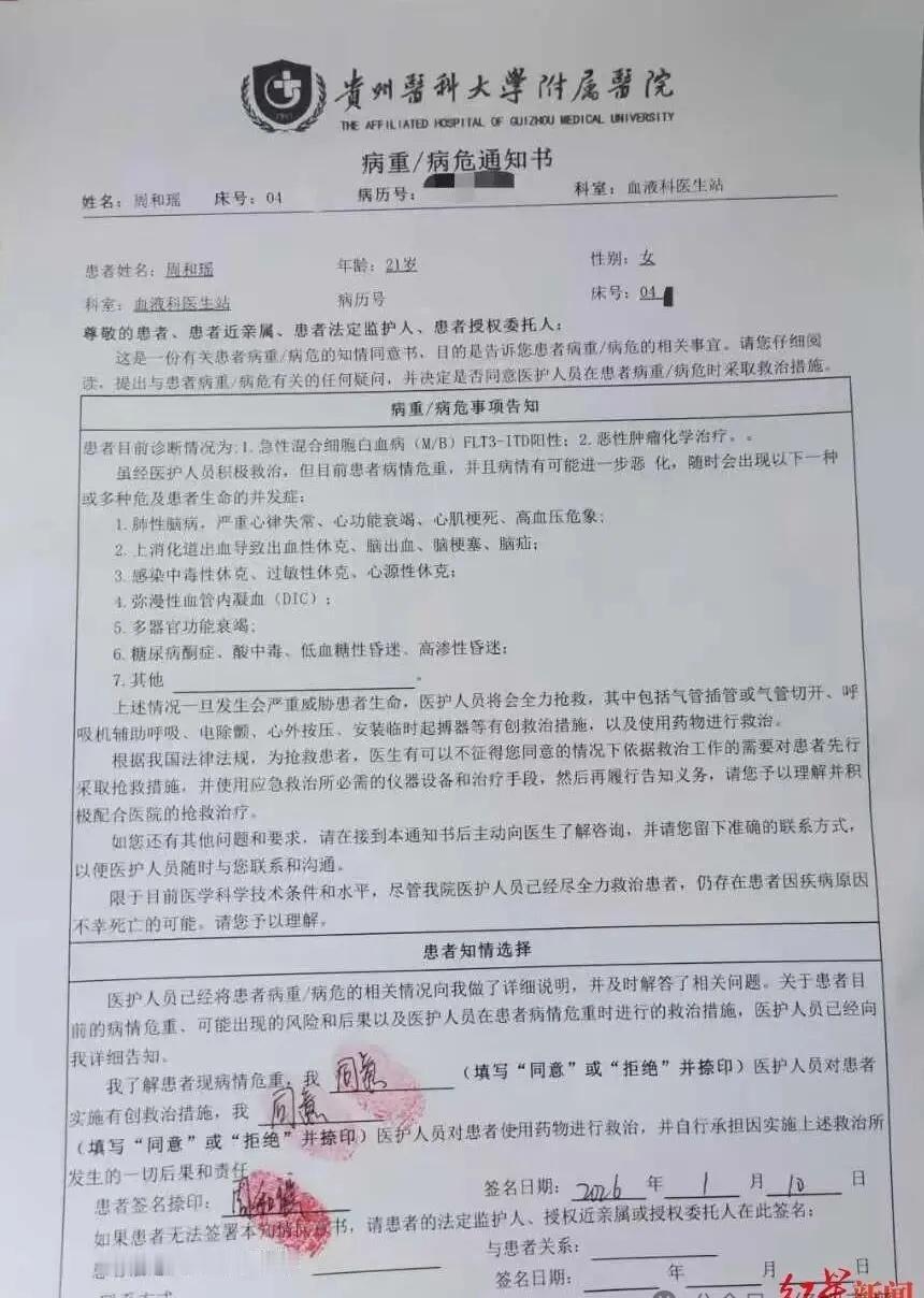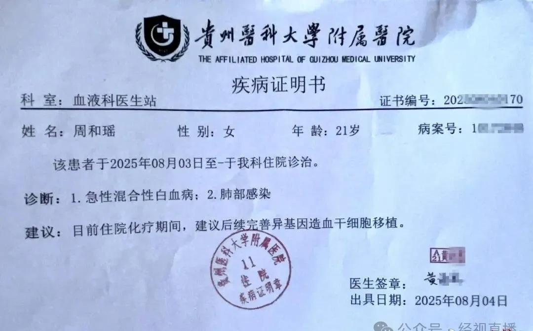 【紧急寻亲!21岁白血病女生寻亲求生机 唯一线索指向四川亲生父母】21岁贵州女大学生周和瑶患急性混合细胞白血病病危,急需造血干细胞移植,唯一希望寄托于亲生父母。襁褓中字条显示,她2004年正月十九生于贵阳太慈桥,亲生父母为四川人,因当年困境无奈遗弃。 养父母配型失败,中华骨髓库配型存疑。她不怪亲生父母,只求能做一次骨髓配型检测,换一次活下去的机会。恳请四川及贵阳知情人士提供线索,帮这个热爱音乐的女孩点亮生机!🙏