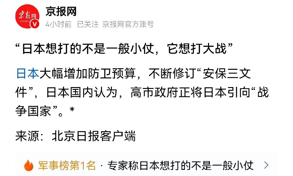 央媒及地方官媒同日发声,对近期日本国内军国主义复活,加速扩军备战,充当美帝马前卒,企图与东方大国一战决雌雄的斗胆妄想,进行严厉警告:(日本的结局)有可能比二战更加惨烈,将会承受灭顶之灾! 我想,我们在高市早苗刚宣布解散日本众议院,正全力准备国会议员选举的关键时刻,强力发声予以严正警告,既是在提醒日本当权者,不要误判形势,一条路走到黑,自取其辱;又是在提醒日本选民们,是时候用选票表达意见,做出正确选择,将祸国殃民者赶下执政舞台,让中日关系重回正轨。 否则,到时候一旦战争打响,他们后悔都来不及! 勿谓言之不预也。