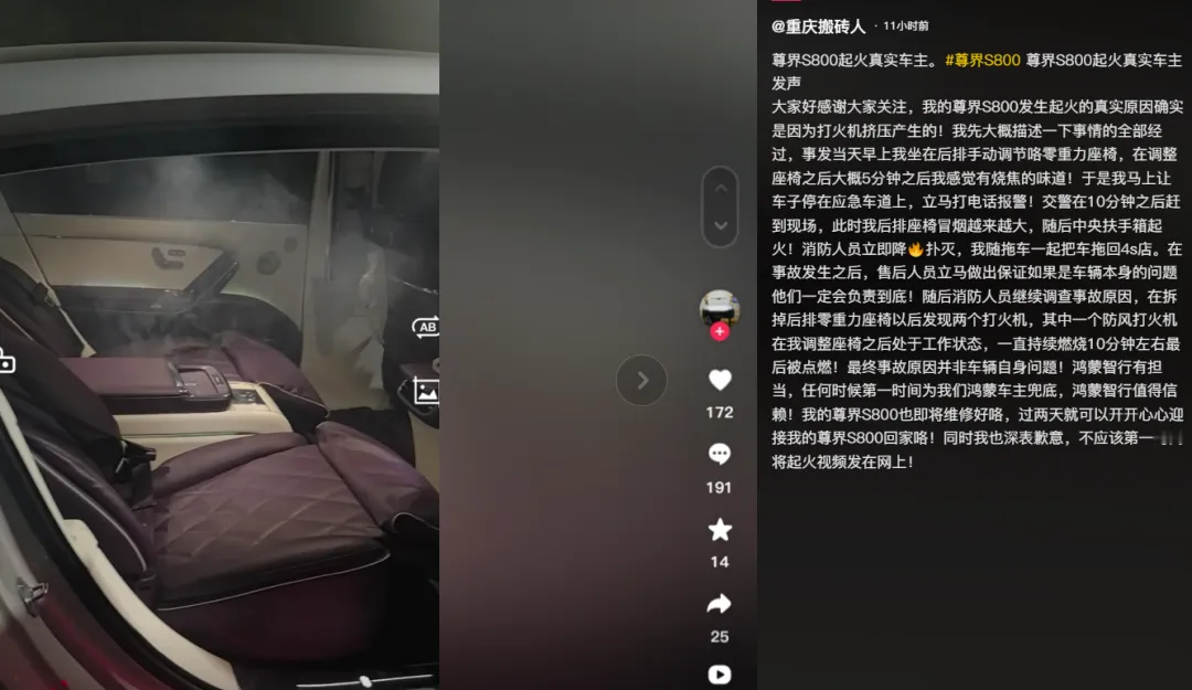 关于重庆那台尊界 S800 车内着火这件事,黑子们可以闭嘴了。