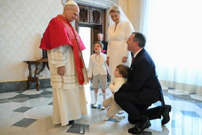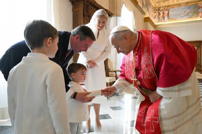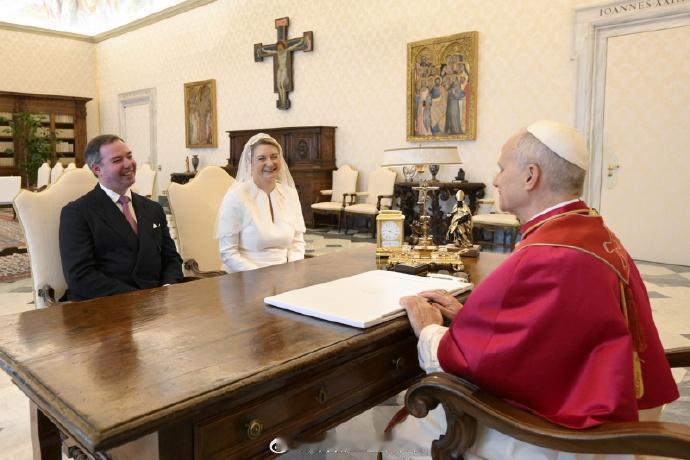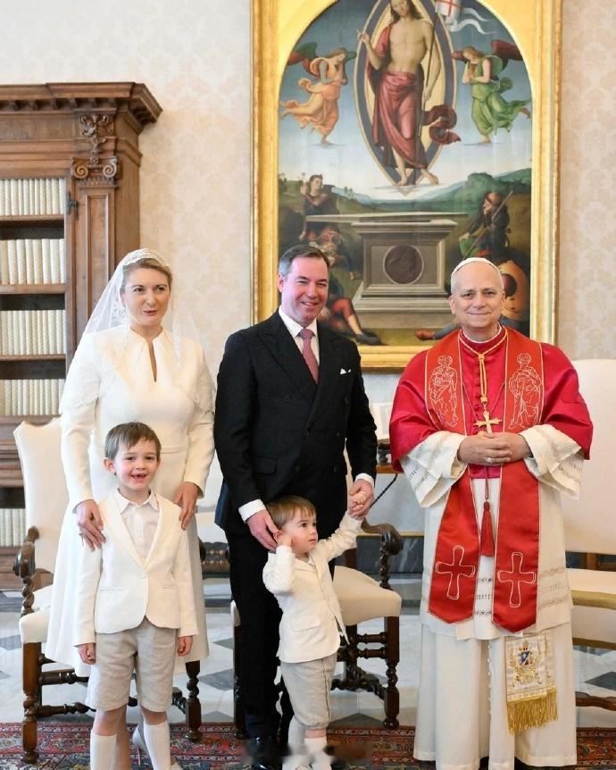 1月23日,卢森堡大公纪尧姆、大公夫人斯蒂芬妮带着俩儿子夏尔和弗朗索瓦到梵蒂冈觐见教皇 纪尧姆去年10月才即位,按照不成文的惯例,走访了一下关系密切的欧洲其他国家,此前已经去了德国、荷兰和比利时。而卢森堡是个天主教国家,去梵蒂冈也是意料之中 而且如大家所知,教皇利奥(or翻译成“良”)十四世也是去年才就任,已故老教皇方济各最后外访还去过卢森堡,rua过纪尧姆的两个娃 顺带一提,斯蒂芬妮以卢森堡大公夫人的身份到梵蒂冈穿白色裙子是一种特权,目前仅有她、比利时两个王后、西班牙两个王后和摩纳哥王妃拥有