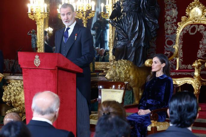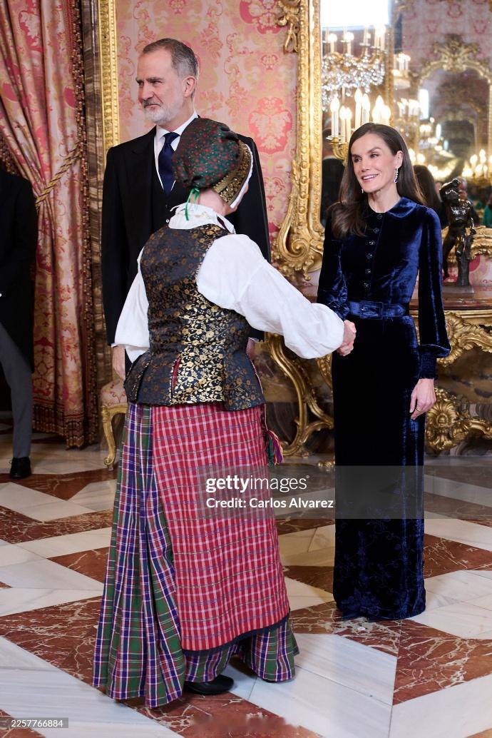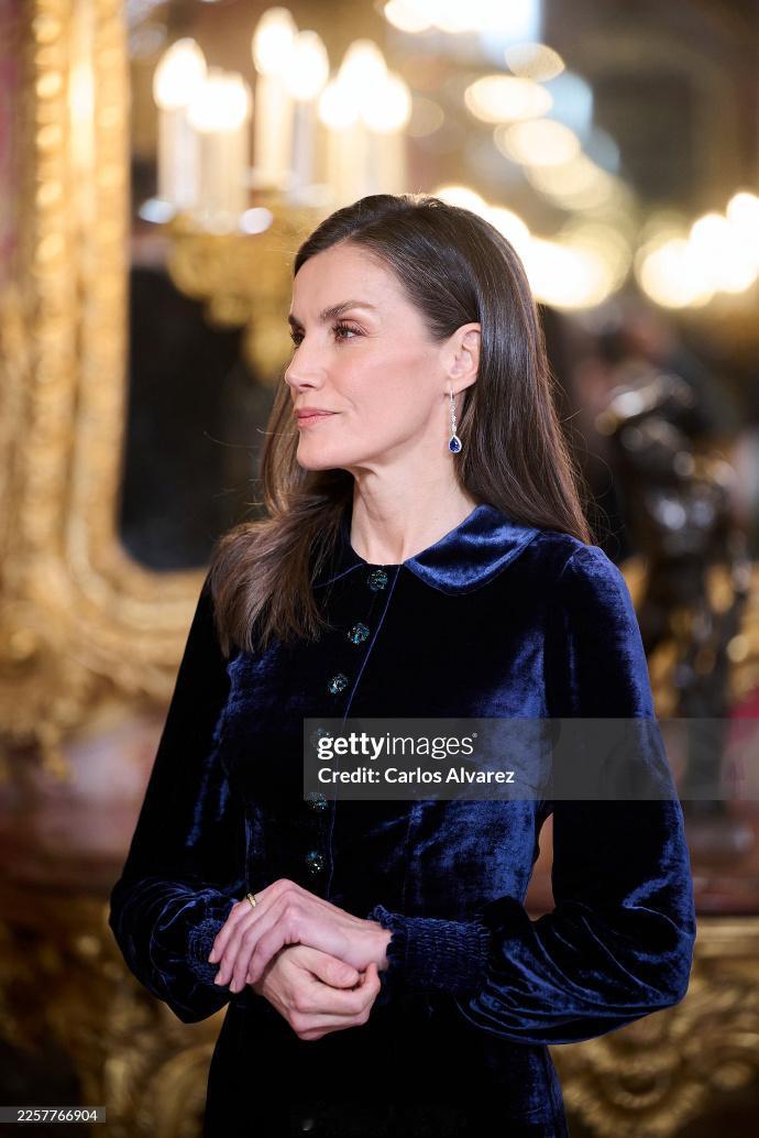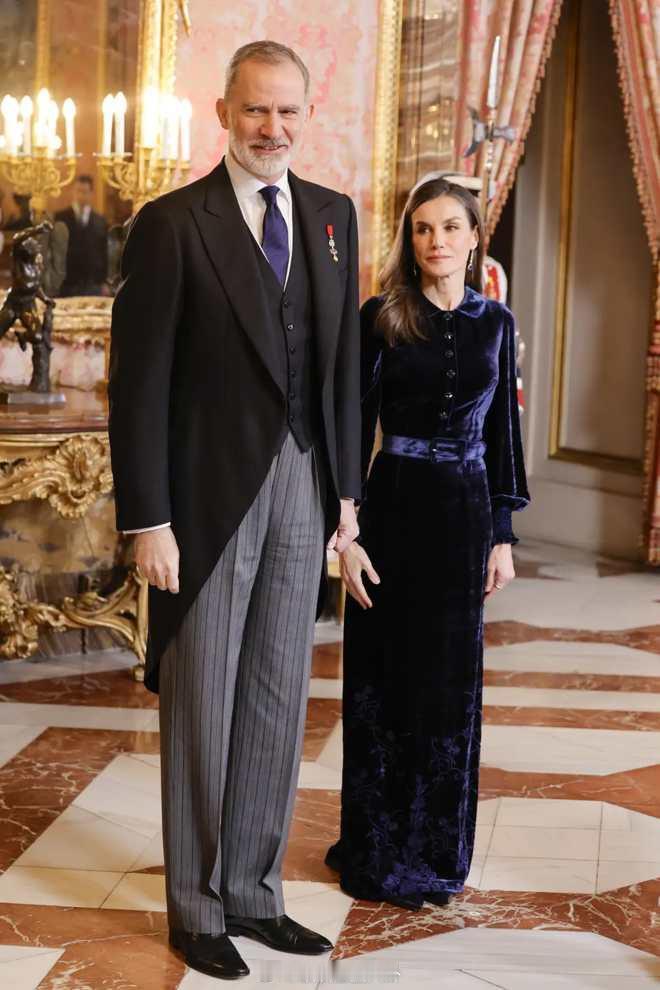 1月23日,西班牙国王费利佩六世和王后莱蒂齐亚在马德里王宫为驻西班牙外交使团举行了传统的年度新年招待会。与往年一样,国王和王后热情接待了来自126个驻西班牙大使馆和近800个领事馆的外交使团代表 莱蒂齐亚身着设计师FELIPE VARELA 设计的蓝色丝绒礼服出席此次活动,FV曾经是莱蒂齐亚很喜欢的本土设计师。这条礼服最早见于2018年1月在复活节军事仪式,并于2020年2月在为外交使团举办的招待会上再次穿着 珠宝方面,则可见一对水滴形蓝宝石耳环,莱蒂齐亚戴了很多年,具体来源尚不明确