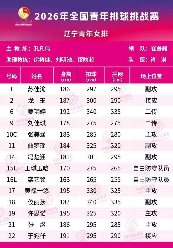 【辽宁青年女排名单惊人~】 2026全国青年排球挑战赛女子组 即将在秦皇岛集结开战! 一共有10支队伍参与角逐! 辽宁青年女排数据颇为惊人~ 二传姜玥婷身高192,扣球340 副攻仪丽莎身高187,扣球也有340 还有主攻黄禄一悠,身高195,扣球330 主攻许思诺身高也是195真 是325的扣球也很牛了~ 还有一个184的副攻曲梦瑶,扣球325的 虽然咱们一般测的都是摸高 能达到恁高也很了不得了~ 作为辽宁球迷感觉甚不可思议! 要是真的话埃格努看了都得叹气~ BTW:主教练孔凡伟是自由人出身的 也曾入选过国家队 是出生于鲅鱼圈的小伙子 跟辽宁女排之前的主教练马子辉同一批