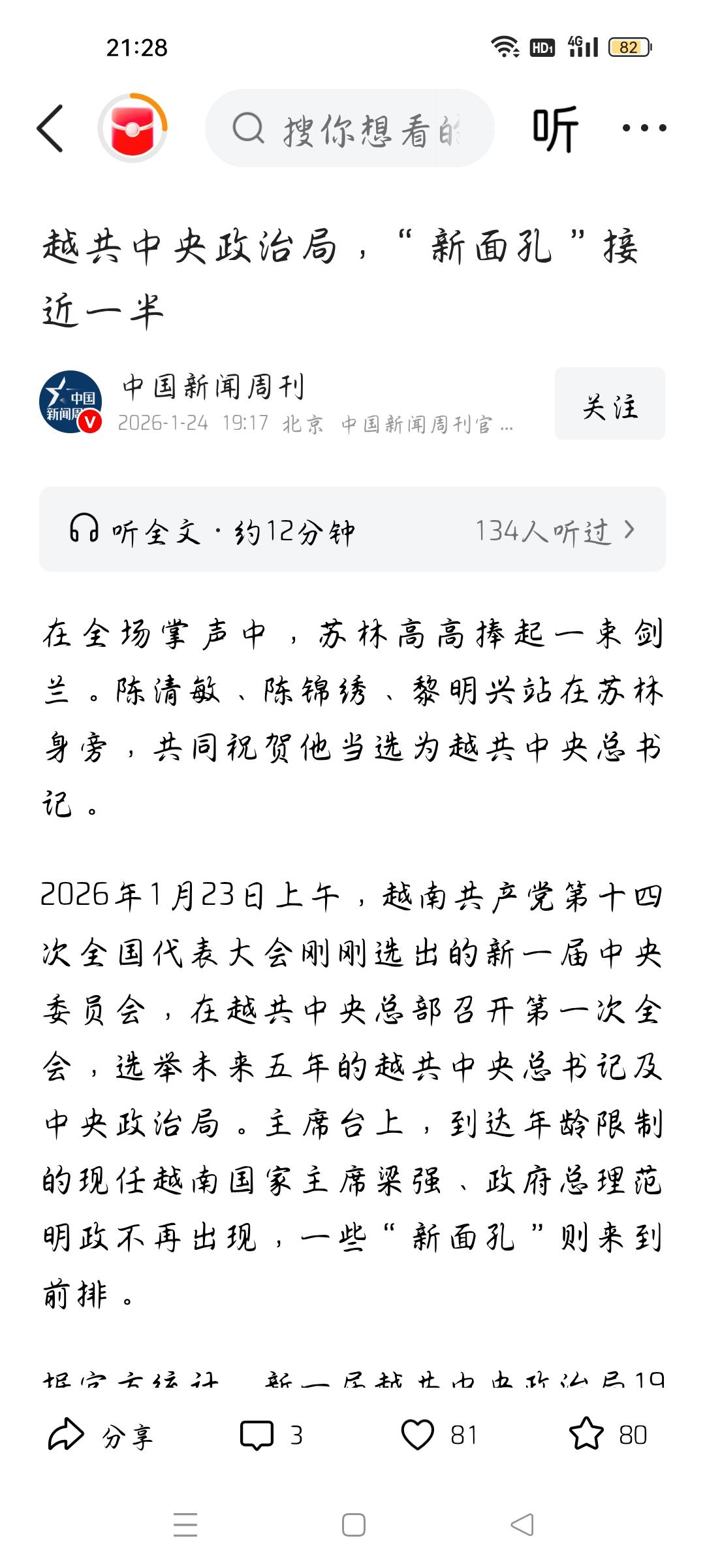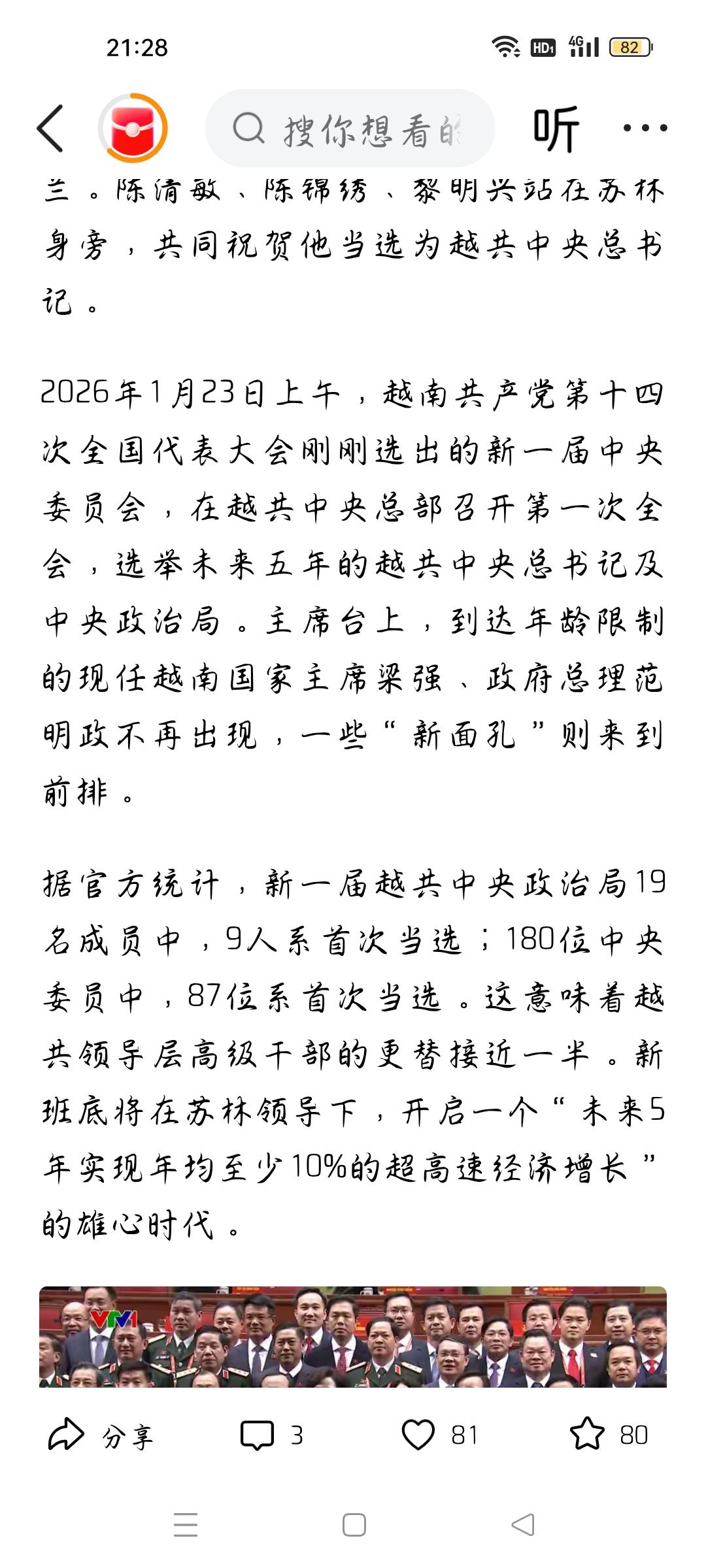 越共中央政治局“新面孔"接近一半,我想说 据中国新闻周刊报道,越共十四大召开,越共中央总部召开第一次全会,苏林当选为越共中央总书记,中央政治局19名成员中,有9人是新当选,越共中央政治局“新面孔"接近一半,说明了越共中央在进行新老交替,一大批年轻有为的实干家进入了中央政治局,为领导层充实了新鲜血液,苏林大胆起用新手,起用有留学背景的官员,相信这些官员的加入,有助于越共领导能力的提升,有助于越南经济的发展。各位条友觉得呢?