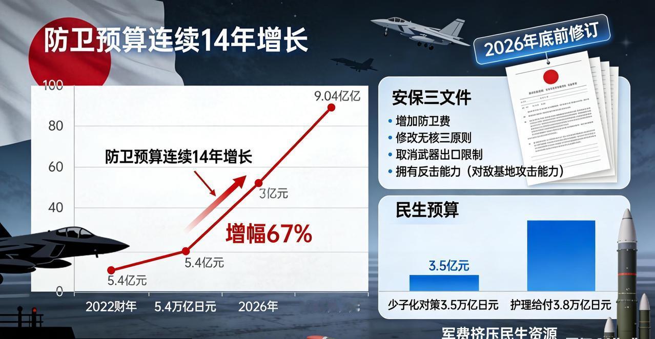 日本砸43万亿扩军,还想碰核武器?其战争逻辑比二战时更疯狂 谁能想到,和平宪法成了日本的“摆设”?2026财年防卫预算直接飙到9.0353万亿日元,五年狂砸43万亿!取消武器出口限制、改航母、搞隐身战机,现在连“无核三原则”都想改,日本这波操作,明摆着是要往“战争国家”的坑里跳! 先看组扎眼的数据,就知道日本有多疯狂。2026财年的9万亿防卫预算,比去年足足涨了近10%,这已经是连续多年大幅上涨。更狠的是五年43万亿的总计划,折合人民币超2万亿,相当于日本每年把GDP的2%以上砸进军事里,甚至有消息说他们还想提到5%。要知道,日本现在物价涨得厉害,2025年消费者价格指数还高于2.5%,老百姓日子都紧巴巴的,政府却不管民生,一门心思搞军备,这操作真的看不懂?其实背后全是算计。 军事评论员杜文龙早就点透了:日本引进隐身战机、改造航母,根本不是为了应对小规模冲突,而是要提升远程打击能力,跟着美国在亚太甚至全球打仗。想想看,日本的“出云”级航母改造后,能搭载F-35B隐身战机,作战半径直接覆盖周边海域;再加上采购的远程巡航导弹,所谓的“自卫队”早就突破了防御范畴,成了能主动出击的进攻性力量。 更危险的是,日本现在连“红线”都敢踩。之前还遮遮掩掩,现在直接推进修订“安保三文件”,明目张胆取消武器出口限制,甚至在自民党内公开讨论修改“无核三原则”。这可不是小事,一旦“无核三原则”被打破,日本离拥有核武器可能就差一步。要知道,日本有完整的核燃料循环体系,只要政府点头,短时间内就能具备核能力,这对整个亚洲来说都是巨大威胁。 日本的战争逻辑很简单:抱美国大腿,借“安保合作”之名壮大自己,最终实现军事正常化甚至霸权野心。他们以为跟着美国就能高枕无忧,却忘了美国从来都是“利己主义”。就像专家说的,单凭日本自己的力量,根本赢不了对大国的战争,一旦卷入冲突,后果比二战还惨,可能面临毁灭性打击。 连日本老百姓都看不下去了。2026年1月,东京、长崎等地民众连续集会抗议,要求政府坚守“无核三原则”,停止扩军。早在2024年,东京、大阪等地就爆发了一百二十多场抗议活动,教师、护士、退休自卫队员都站了出来。民意调查显示,68%的民众反对为军费加税,54%担心教育和养老资金被挪用。大家都清楚,跟着政府搞军事冒险,最终遭殃的还是普通民众。 国际社会也看得明明白白。中国外交部多次强调《开罗宣言》《波茨坦公告》有效,韩国更是在2025年国防白皮书里直接指出,日本发展进攻性力量破坏地区稳定。日本以为靠美国撑腰就能为所欲为,却忘了历史的教训。二战的惨败还历历在目,现在又想重蹈覆辙,这种疯狂的战争逻辑,迟早会让日本付出惨痛代价。 43万亿扩军费、修改和平宪法、觊觎核武器,日本的每一步都在挑战地区和平的底线。警钟已经敲响,要是放任其发展,亚太地区的稳定将不复存在。对于日本的野心,我们必须保持高度警惕!