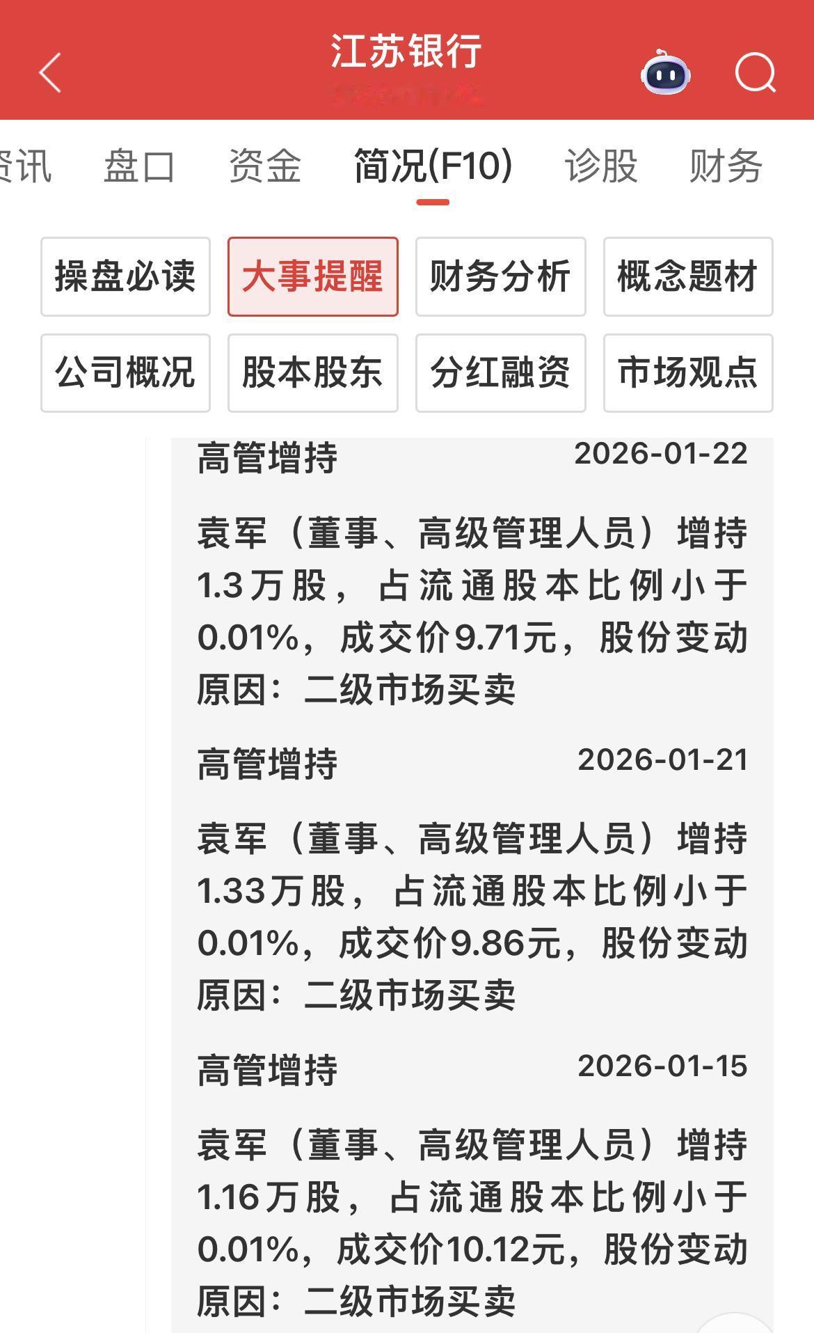 近期、江苏银行袁行长连续增持三次! 本人也连续增持(回补)多次! …………………………………… 看到周老师向江苏银行投关部提出的问题很有代表性,感谢周老师的用心! 江苏银行回复: 1、没有再融资计划,核充低靠利润补; 2、分红保持稳定,30%比例原则上不变; 3、开门红存贷两旺; 4、董事长没有变化; 5、业绩快报的问题,会向行长反映; 6、江苏银行下跌的原因:板块轮动所导致。 江苏银行的回复,是一粒定心丸,我准备…… …………………………….