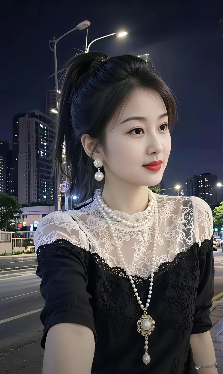 夜晚街拍,优雅黑裙搭配珍珠项链,气质满分!🌃✨