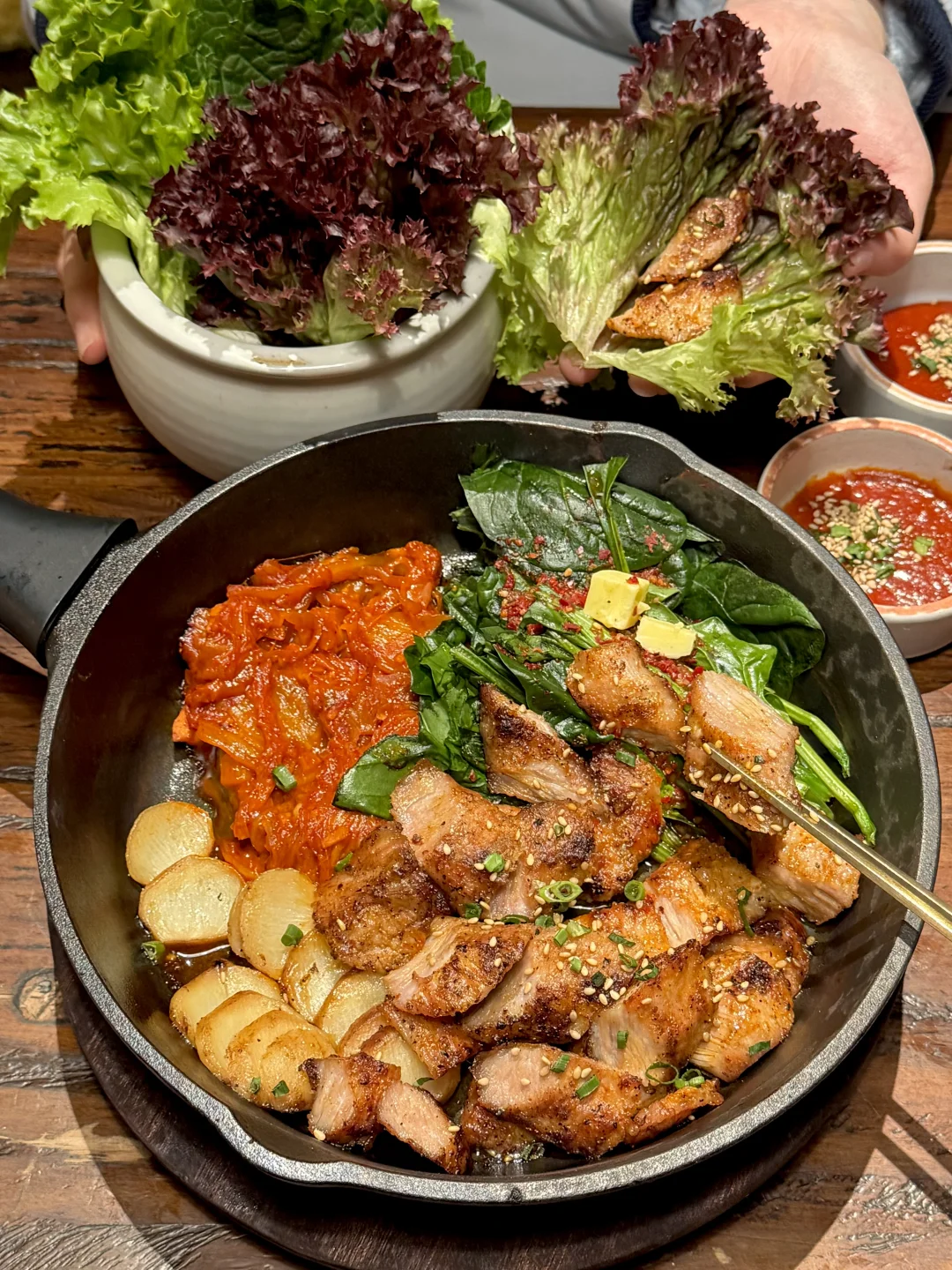杭州韩料巨头!!氛围可好了,而且宠物友好~ 韩式普洱糯米参鸡汤!!热乎乎的吼吼喝!!! 招牌火腿泡菜饭,刚做好就被一扫而空🤤 蒜香干烹鸡、JEJU银鱼酱铁锅猪颈肉、提拉米苏… 经常和朋友来这里聚餐,都是反复会点的~