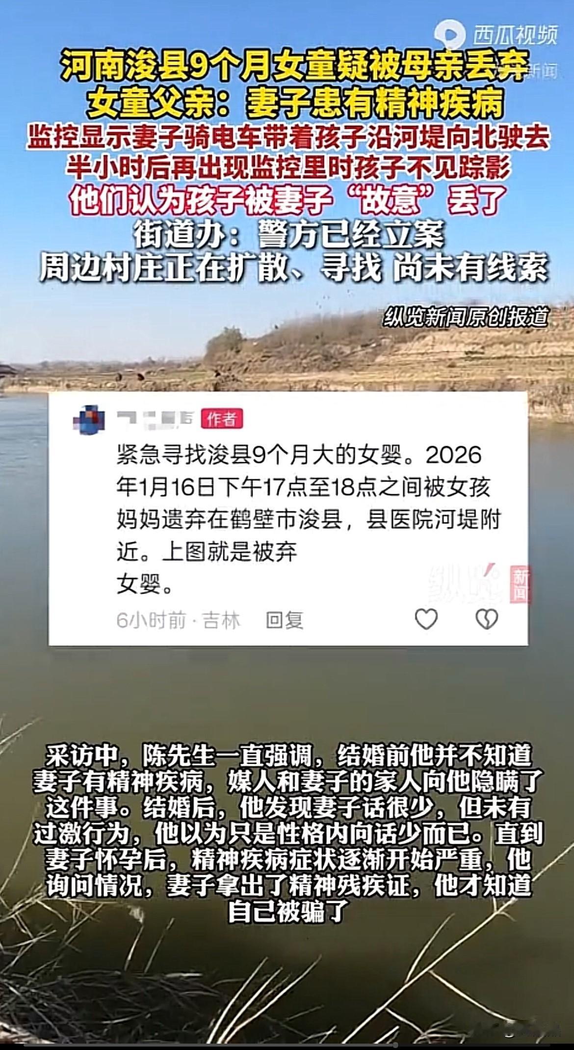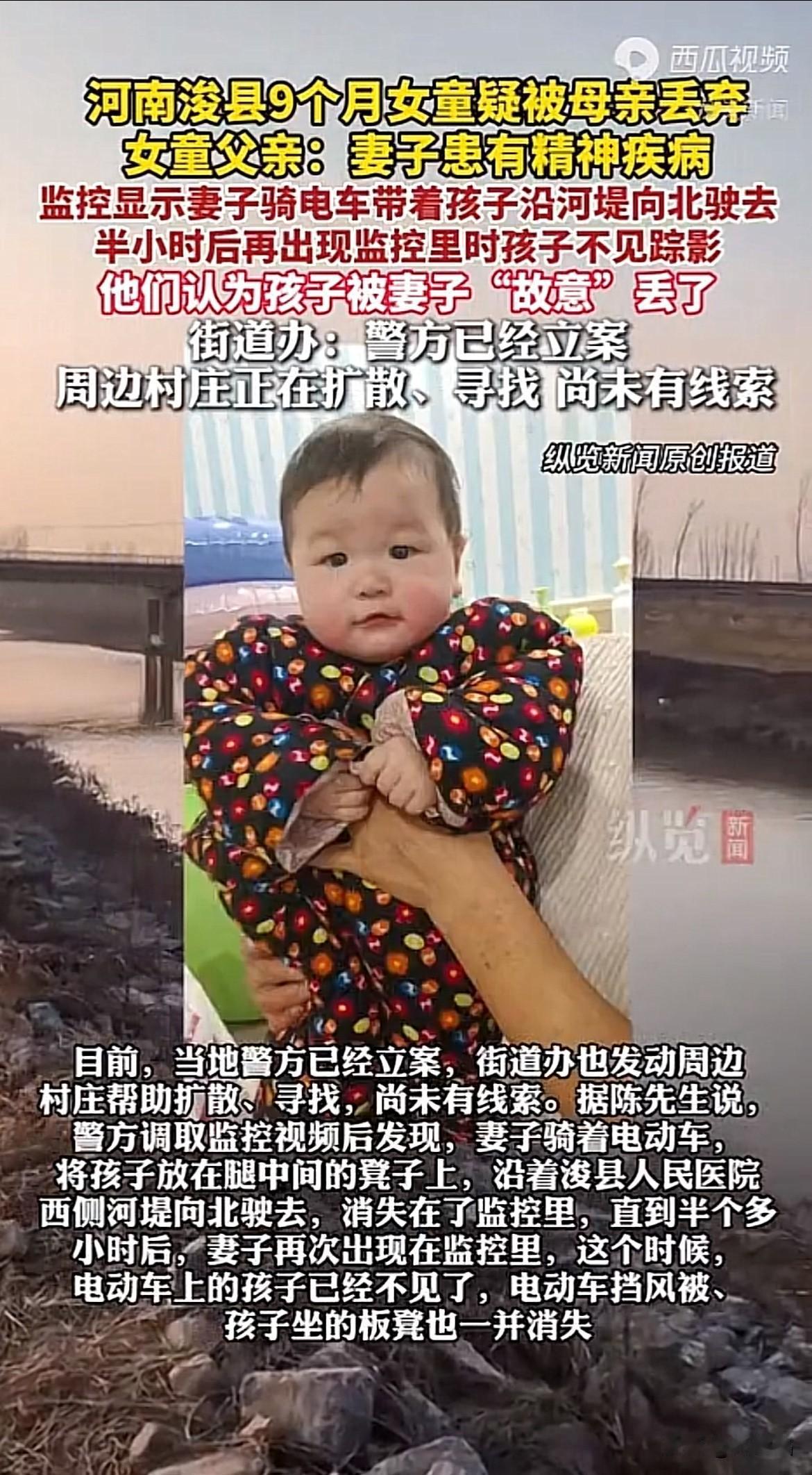 可怜的孩子!河南浚县,一名9个月大的女童被亲生母亲遗弃在医院西侧河堤,父亲得知后赶去寻找,孩子不见踪迹,至今8天了,仍是下落不明。 1月16日,孩子父亲陈先生有事外出,妻子在家带娃,妻子跟家人说出去买点吃的,开着电动车就出去了,等陈先生回到家仍未见妻子回家,察觉不对劲,出门寻找妻子。 陈先生在岳父家找到妻子,可不见孩子,追问下,岳父母才透露实情,说妻子把孩子丢弃在人民医院西侧河堤。 陈先生连忙赶去河堤寻找,可不见孩子踪迹,报警查看监控,发现妻子带孩子到河堤附近监控盲区,半小时后妻子一个人返回,唯独不见孩子。 原来,妻子患有精神病,婚前隐瞒病史,婚后妻子怀孕发病,陈先生追问下才得知,丢弃孩子当天妻子表现正常,早上还吃了药,没想到会突然把孩子丢弃。 可怜这么小的孩子被丢弃在河堤,这么小根本无法自理,截止目前已经过去8天了,还没找到,希望是好心人抱走安置了。 有网友说孩子母亲患精神病,可能是故意丢弃,坐凳和电动车挡风披风找到了,孩子如果被别人救走,坐凳这些应该也会带走,最坏的可能是孩子被丢到河里了。 看完太心酸,希望孩子早日被找到,希望多多转发,让附近的居民看到、知道,提供线索助力早日找到这可怜的孩子。