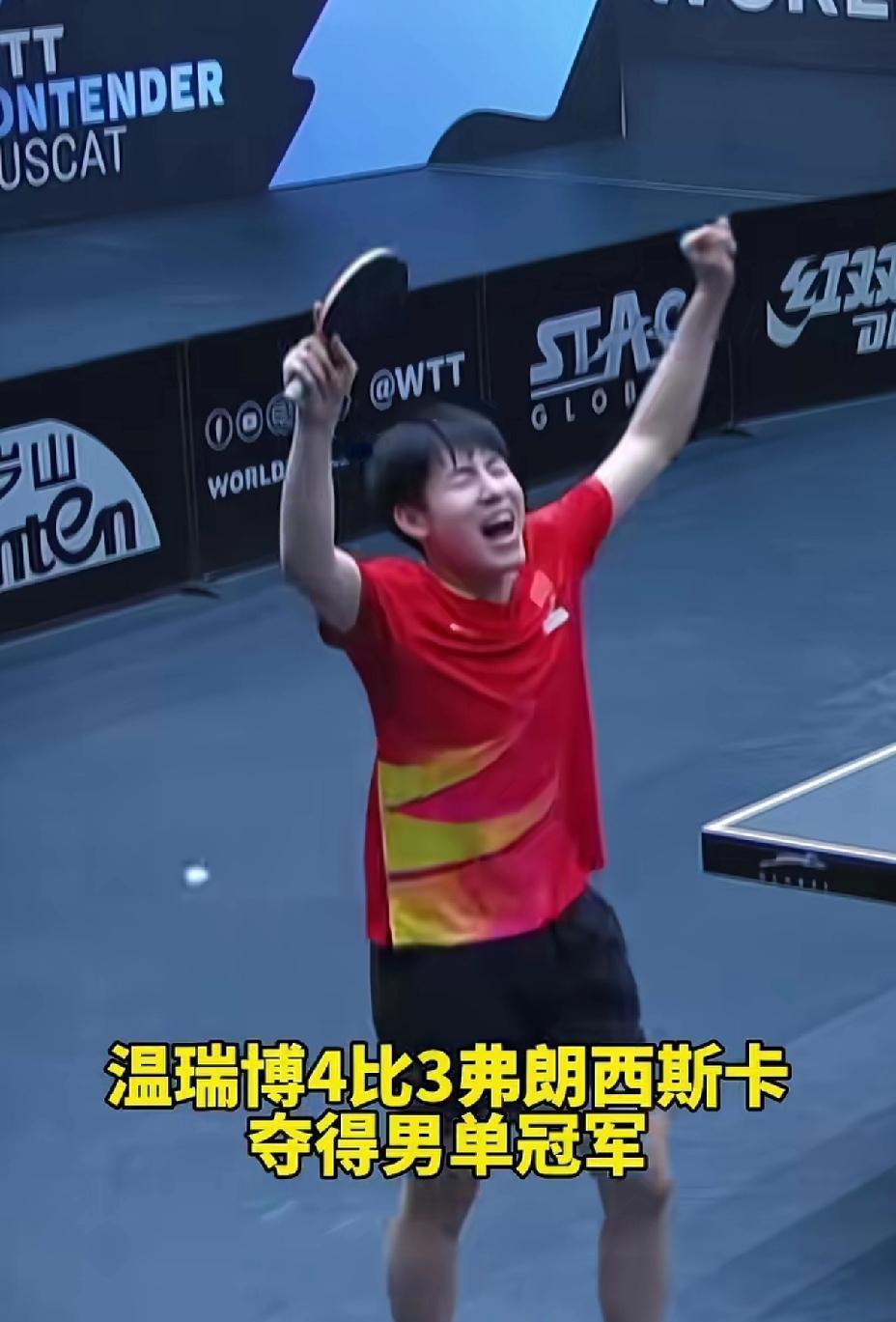 温瑞博夺冠了, 这个冠军的含金量十足, 拼出了国乒男队的希望。 马斯喀特常规赛, 温瑞博4:3佛朗西斯卡, 夺得男单冠军。 这是一场跌宕起伏的比赛, 先是连赢三局, 又连输三局, 在决胜局又是险胜。 这种比赛打满七局非常锻炼人, 因为对手很强, 还一度拿到过赛点。 就这样小温愣是硬生生的又夺了回来, 这比4:0拿下收获更大。 志强教练作为场外指导也是很给力, 全程都是鼓励和肯定, 几乎没有黑脸, 情绪价值满满, 这样运动员也有底气。 下次给教练准备点速效救心丸和金嗓子, 一场比赛下来又费心脏又费嗓子, 所以说冠军从来不是一个人的荣耀。 半个月的时间, 林德、杜达、雨果、达科、弗朗西斯卡,五员名将都被他“干掉”了。 年轻小将未来可期! 恭喜温瑞博! 保持住这股劲, 继续往前冲!! (图片源自于网络)