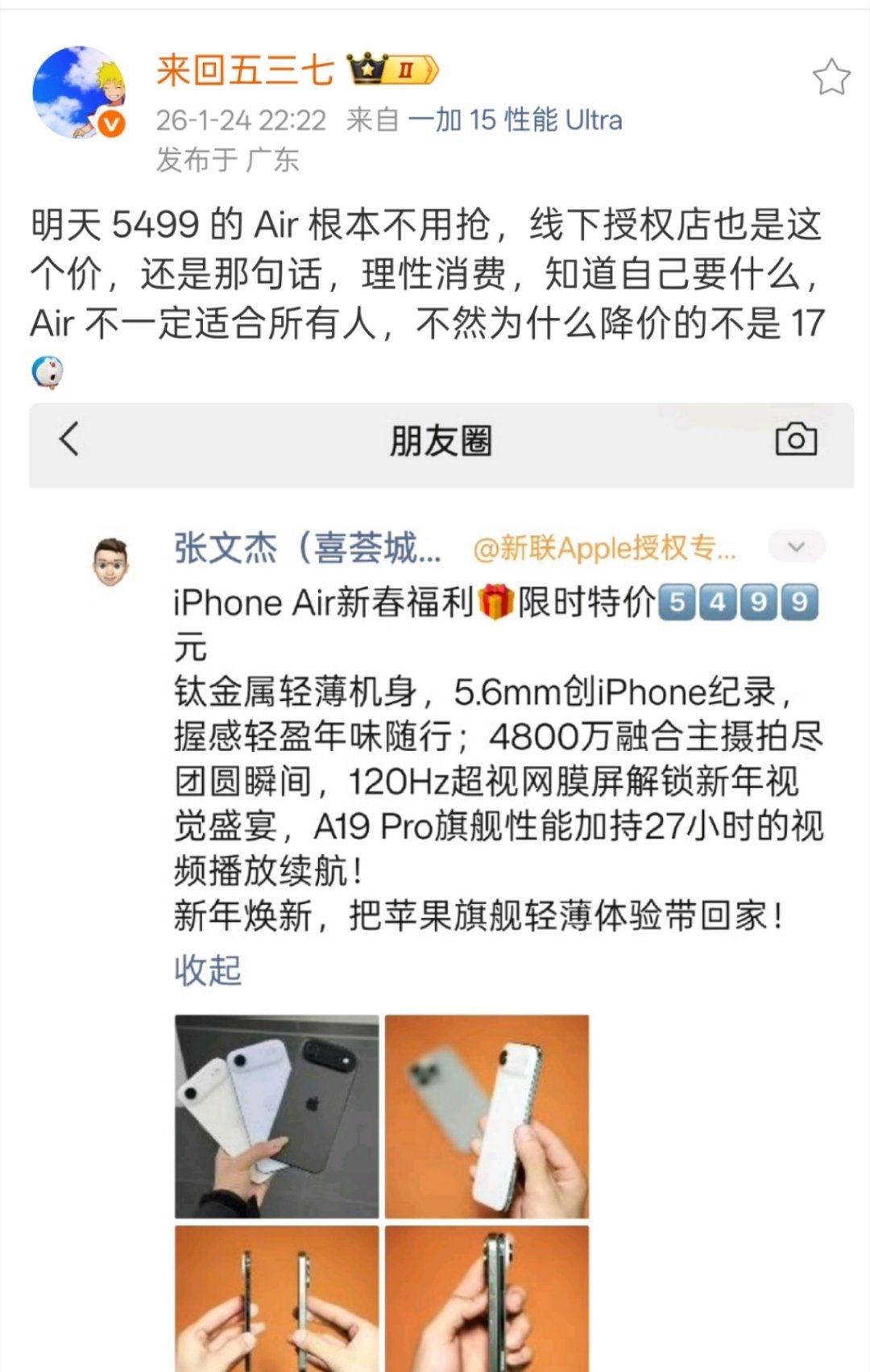 iPhone Air真的要坐实苹果降价最快的新机了,A19pro芯片,原价7999,开售不到100天,线上线下都有5499了。