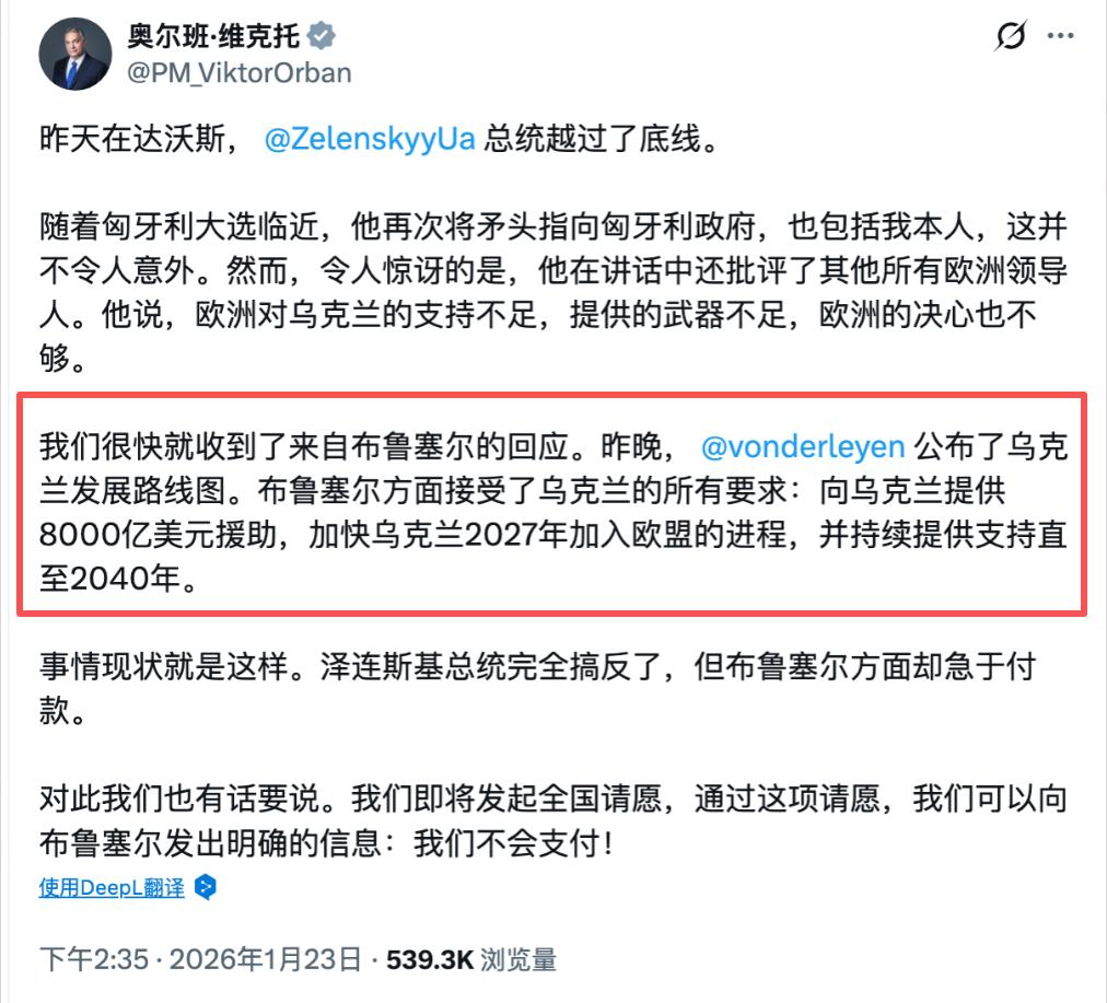 匈牙利总理一开口,直接抛出了个炸场消息——欧盟居然全盘接受了乌克兰的所有要求,8000亿美元援助砸过去,还承诺加快乌克兰2027年入盟进程,后续支持要一直给到2040年。 这消息一出来,不管是欧洲民众还是外界看客,都懵了圈。要知道现在欧盟自己都快泥菩萨过河了,经济扛着巨大压力,各国老百姓的抱怨声就没断过,这种节骨眼上,居然敢把这么大一笔钱扔去乌克兰,实在让人看不懂。 说欧盟经济糟糕,真不是夸大其词。就拿德国来说,作为欧盟的老大哥,以前工业实力多能打,现在却彻底没了往日的精气神。 各大机构预测2026年德国GDP增长率也就0.8%到1.4%之间,而且其中三分之一的增长还是靠政府砸钱堆出来的,不是私人投资和生产率复苏带来的实打实增长。 工业领域更是惨,连续四年工业产出萎缩,汽车、造纸、纺织这些传统优势行业都在走下坡路,不少企业都在计划裁员,46个行业协会里有22个预计2026年要减员。 工厂里的机器转得慢吞吞的,企业投资意愿低得可怜,美国的关税政策更是让德国出口雪上加霜,经济稳定在一个很低的水平,想复苏却怎么也提不上劲儿。 德国日子不好过,法国也好不到哪儿去。街头上的抗议活动就像家常便饭,从来没真正平息过。 老百姓抗议的核心不是别的,就是日子过不下去了——物价居高不下,生活成本一个劲儿涨,工资却跟不上节奏,服务业和核心通胀的黏性一直都在,手里的钱越来越不值钱。 除了民生问题,法国在欧盟援乌的立场上也藏着自己的小算盘,就拿军事援助来说,一直坚持“欧洲武器优先”,说白了就是想借着援乌扶持本土的军工企业。 可这种想法又和德国、荷兰等国产生了分歧,背后的矛盾远比表面看起来更复杂。不光德法,整个欧盟的经济都处在“慢增长、高焦虑”的状态里。2025年和2026年欧盟整体经济增速都只有1.4%左右,欧元区债务率还在持续上行,预计到2027年能达到91%。 各国政府一边要稳增长,一边要控债务,还要推进绿色转型和安全投入,根本没多余的财力随意挥霍。 更关键的是,民众对援乌的反对声越来越强烈,德国有62%的公民反对增加援乌预算,法国更是有70%的民众反对派兵,匈牙利95%的参与者在全国协商中明确反对乌克兰加入欧盟。 这种民怨沸腾的情况下,欧盟却依然要推进8000亿美元的援乌计划,实在让人摸不着头脑。 其实这笔巨额援助从一开始就充满了争议,匈牙利、捷克、斯洛伐克三国明确反对,欧盟没办法只能启动“强化合作程序”,让其余24个国家推进,这三个国家不用承担财政义务。 而且援助还附带了严格的条件,乌克兰必须在反腐败、司法独立等领域取得实质进展,不然资金可能被冻结,之前就因为泽连斯基试图削弱反腐机构,欧盟暂扣过15亿欧元援助。 更有意思的是,这笔援助本质上是“有限追索权”贷款,乌克兰只有收到俄罗斯战争赔款后才需要偿还。欧盟还保留用冻结的俄罗斯资产清偿债务的权利,这里面的门道,远不止表面看到的那么简单。 还有乌克兰2027年入盟的事,本身就不具备现实基础。欧盟入盟谈判有36个章节的复杂程序,截至2025年底,乌克兰公共投资管理改革的72项措施只完成了35%,反腐和法治改革也滞后于要求。 而且波兰当年在和平环境下完成入盟谈判都用了10年,乌克兰现在还处于战争状态,资源大多向军事倾斜,民事改革根本难以深入。 布鲁塞尔的智库都直言,乌克兰2027年加入欧盟“似乎不可能”。可即便如此,欧盟还是要加快这一进程,背后的考量实在耐人寻味。 要知道匈牙利分摊这笔援助的金额就超过90亿美元,相当于其未来几十年的基本社会支出总额,这意味着该国可能要削减养老金、家庭能源补贴等民生项目,其他国家的财政压力也可想而知。 欧盟各国自己的老百姓还在为物价、就业发愁,工厂机器运转乏力,街头抗议不断,却要把巨额资金投向遥远的战场,还要硬推几乎不可能实现的入盟进程。 大家觉得,欧盟这种“自家都揭不开锅,还硬要打肿脸充胖子”的做法,到底是出于什么考虑?欢迎在评论区说说你的看法。