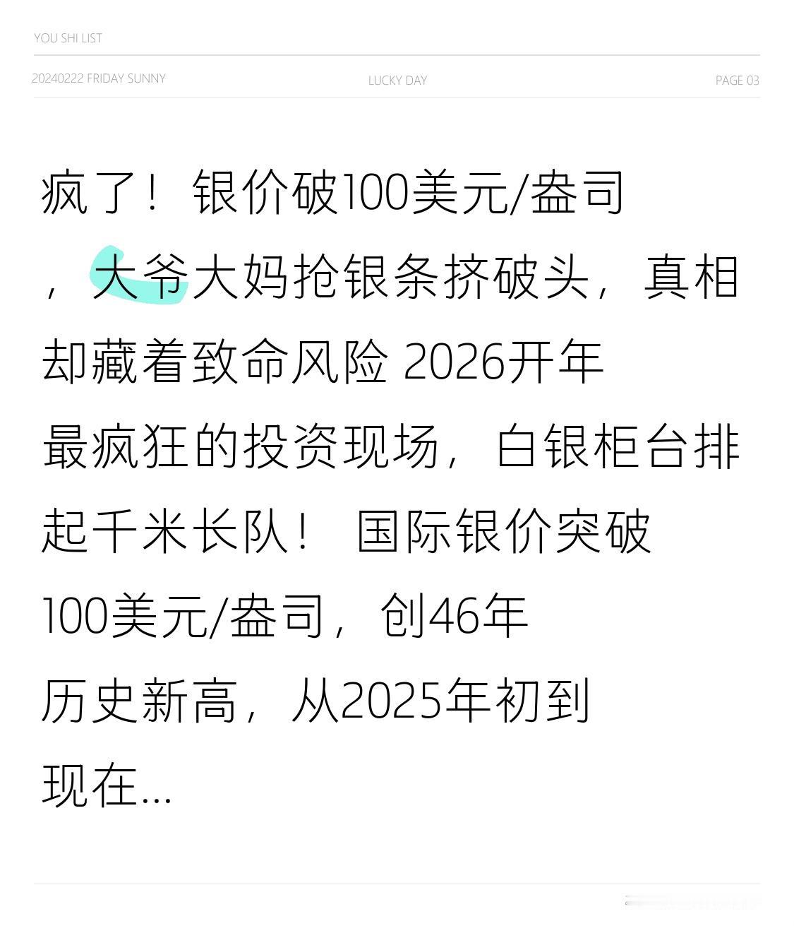疯了!银价破100美元/盎司,大爷大妈抢银条挤破头,真相却藏着致命风险 2026开年最疯狂的投资现场,白银柜台排起千米长队! 国际银价突破100美元/盎司,创46年历史新高,从2025年初到现在暴涨175%,不到1个月又狂涨40%!黄金都被甩在身后,白银成了“顶流资产”。银行柜台前,大爷大妈扛着现金抢银条,100克规格刚上架就秒空;线上白银ETF被疯买,二手平台银饰加价20%还抢着要,有人直言“买白银比炒股靠谱,早买早赚”! 可越疯涨越藏着反转:这波白银暴涨根本不是单纯的避险炒作,而是被光伏、新能源汽车、AI三大赛道“抢着要”的硬刚需!光伏产业一年要耗7560吨白银,占全球需求的55%,新一代电池单位用银量还涨了30%;一辆新能源车用银量是燃油车的3倍,AI服务器更是普通服务器的5倍。需求暴增的同时,供给却卡了脖子——全球72%的白银是铜锌矿副产品,扩产要等5-10年,2026年供需缺口将达8000吨,相当于一年缺了2个“白银大国”的产量。 更让人细思极恐的是,历史正在重演!46年前亨特兄弟囤积白银逼空市场,银价飙到50美元后突然崩盘,家族直接破产;2011年散户抱团“打爆摩根大通”,银价逼近50美元后,8天内5次上调保证金,无数人高位站岗被套数年。现在银价翻倍破百,看似疯涨的背后,风险早已暗流涌动:下游企业正在疯狂“去银化”,无银电镀铜技术已经量产,能降低50%银耗,长期需求可能被颠覆。 更扎心的是普通投资者的误区:有人跟风买工艺银饰,溢价高达50%,想变现时根本没人收;有人加杠杆炒白银期货,一天波动就能亏光本金;还有大爷大妈把养老钱全砸进去,以为能稳赚不赔。专业人士早就提醒:白银是“魔鬼金属”,波动比黄金剧烈3倍,历史上暴涨后必有暴跌,家庭投资占比千万别超10%。 其实大家疯狂抢银,本质是想给财富找个避风港。地缘紧张、美元波动的当下,想通过贵金属保值无可厚非,但千万别被“暴富神话”冲昏头。保守投资者可以选白银ETF或投资银条,分批定投摊薄成本;想追求高收益的,也要避开杠杆,用闲钱小仓位尝试,设置止损线。 投资的核心是保住本金,不是赌一把定输赢。白银暴涨的盛宴里,有人看到机会,有人只看到陷阱。愿每个投资者都能理性跟风,别让46年前的崩盘悲剧重演。 你会跟风买白银吗?评论区聊聊你的看法,觉得提醒有用的点赞转发,让更多人避开投资坑!