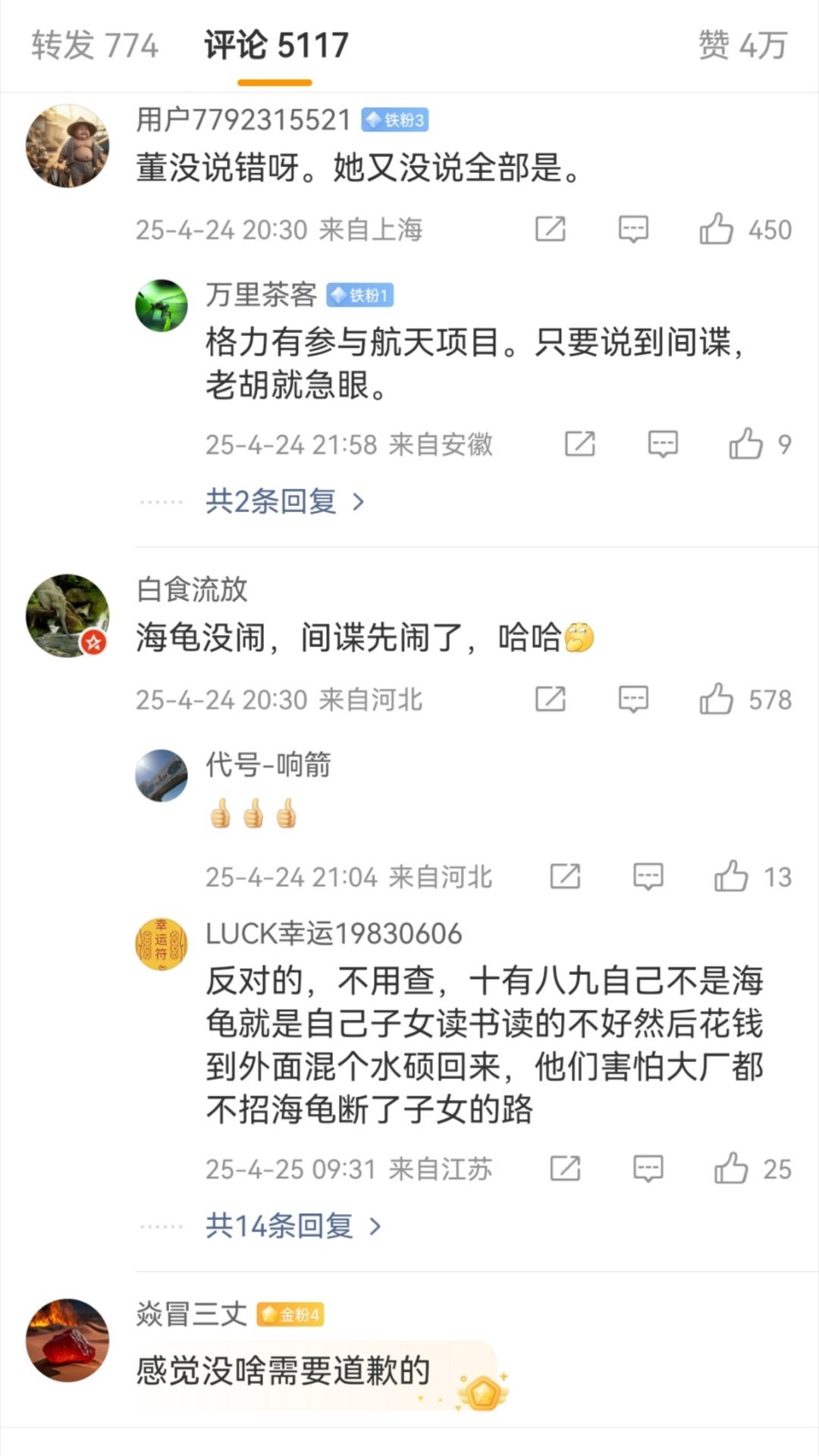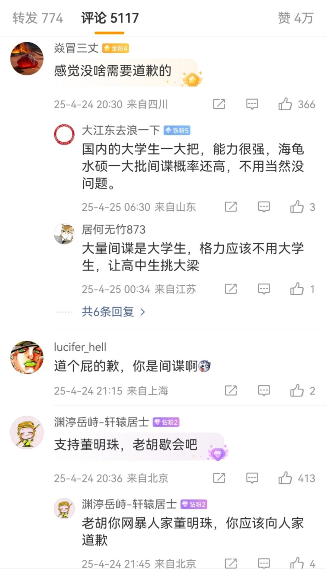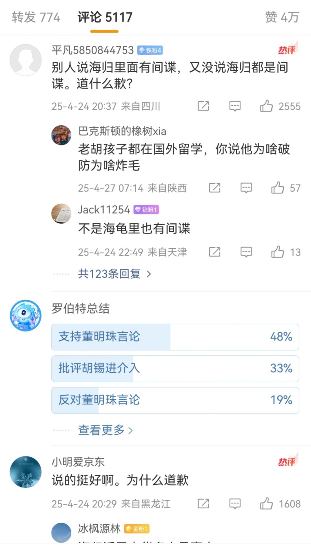 当初董明珠说“海归派里有间谍”,胡锡进说“董明珠应该道歉,希望她听得进批评”。如今牢A热度这么大,老胡是一声不吭...这和当初那个谁,支持高校配三个学伴。但是网友让他女儿当学伴就破口大骂破防的道理是一样的。
