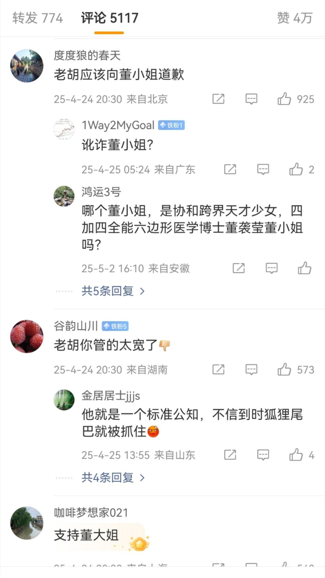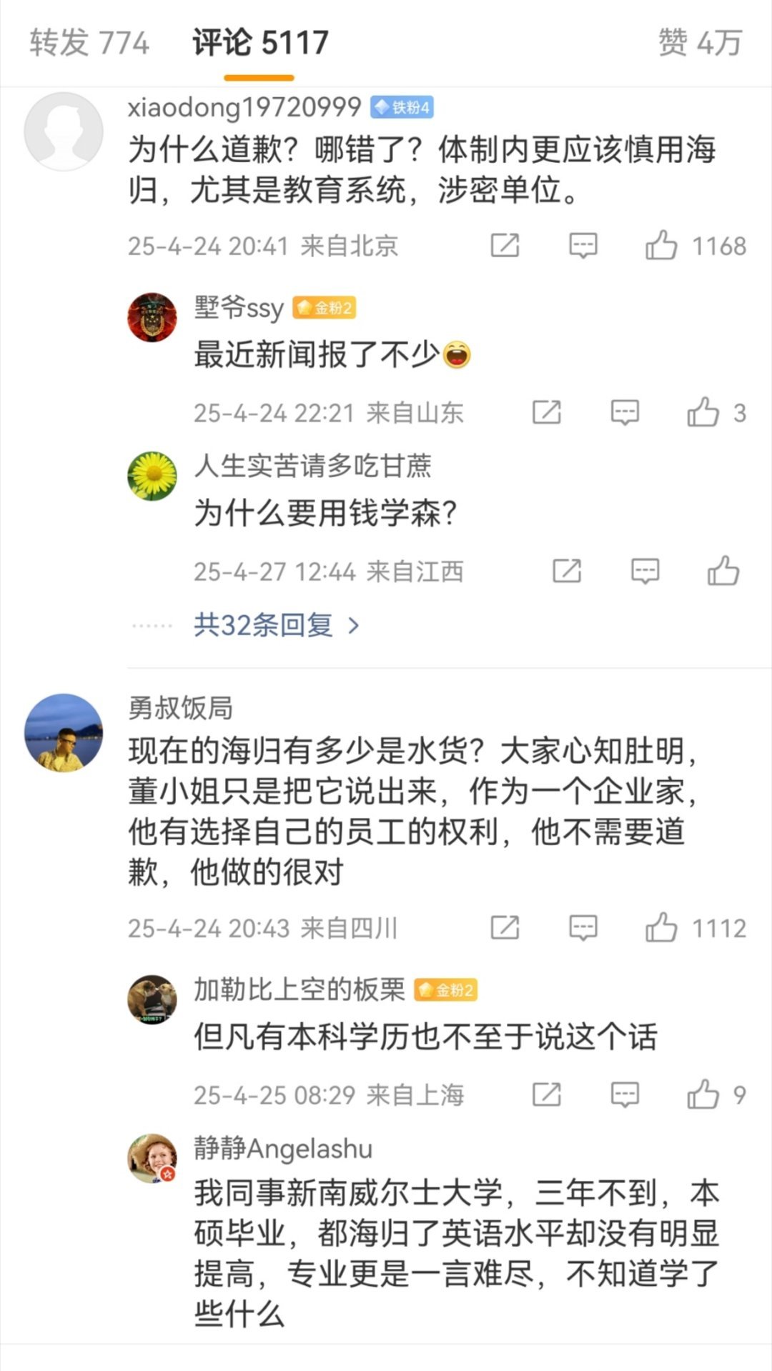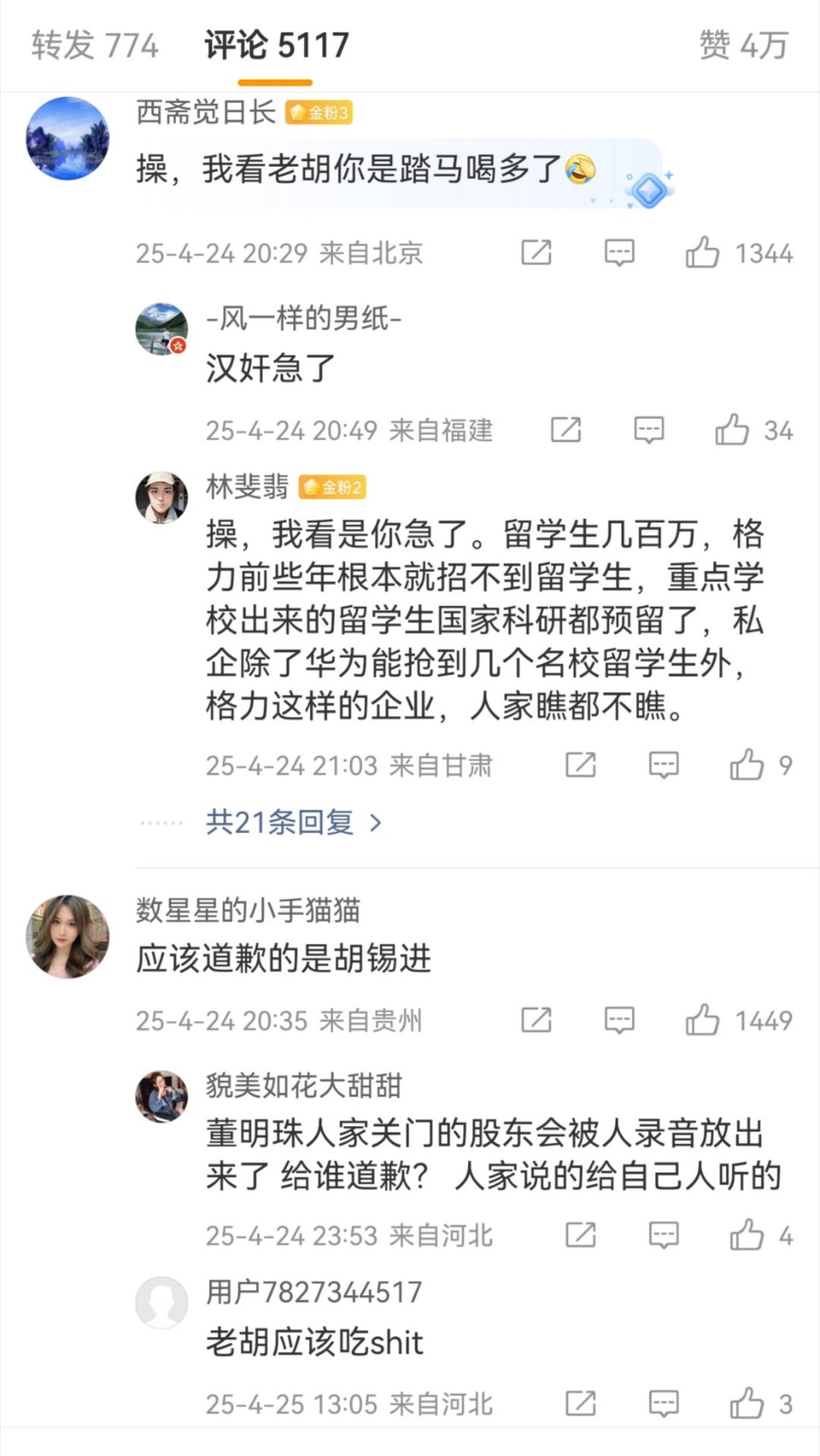 当初董明珠说“海归派里有间谍”,胡锡进说“董明珠应该道歉,希望她听得进批评”。如今牢A热度这么大,老胡是一声不吭...这和当初那个谁,支持高校配三个学伴。但是网友让他女儿当学伴就破口大骂破防的道理是一样的。
