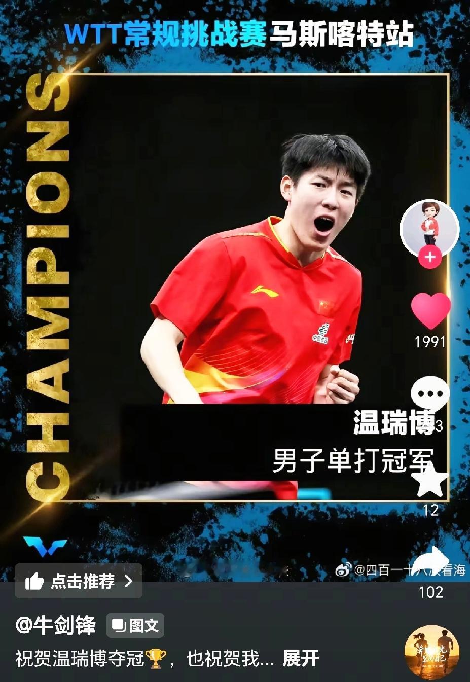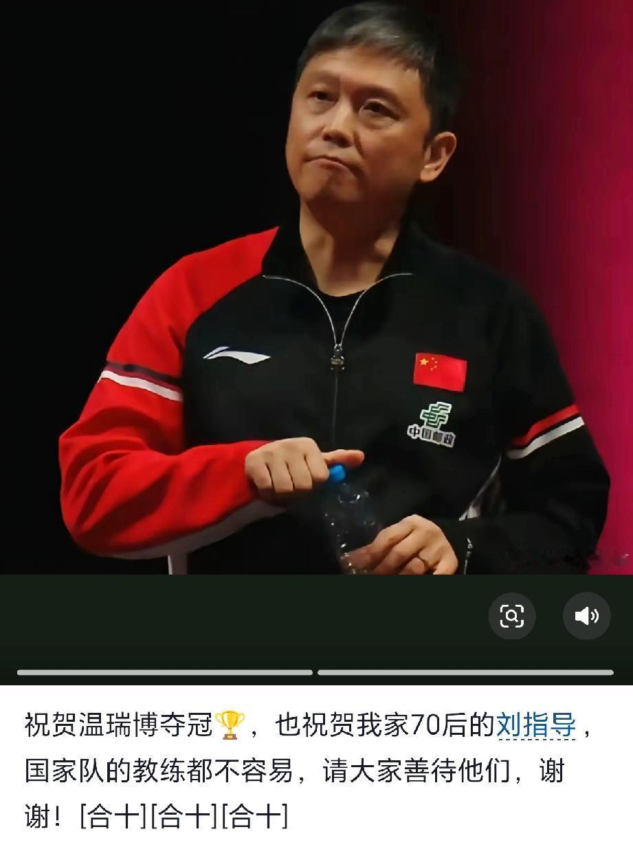 志强教练的爱人牛剑锋罕见发声, 恭喜温瑞博夺冠, 同时调侃她家70后的刘指导, 善待国家队的教练们。 温瑞博夺冠, 对于志强教练开始意义非凡, 手底下又多了一员猛将。 作为刘指导的爱人也是十分高兴。 同时心疼自己80后的爱人。 志强教练是81年生人, 只是乒乓球太“费”教练, 45岁的人已经白发丛生, 看起来像是70后。 牛剑锋看似调侃刘指导显老, 实则是心疼爱人的不容易。 还有透露一个关键信息, 志强教练现在是温瑞博的主管教练, 以后又多了一个打满局的“逆子”, 志强的日子“不好过”呀。 这一个月的高强度工作, 刘指导真是辛苦了, 终于可以好好休息一下了! (图片源自于网络)