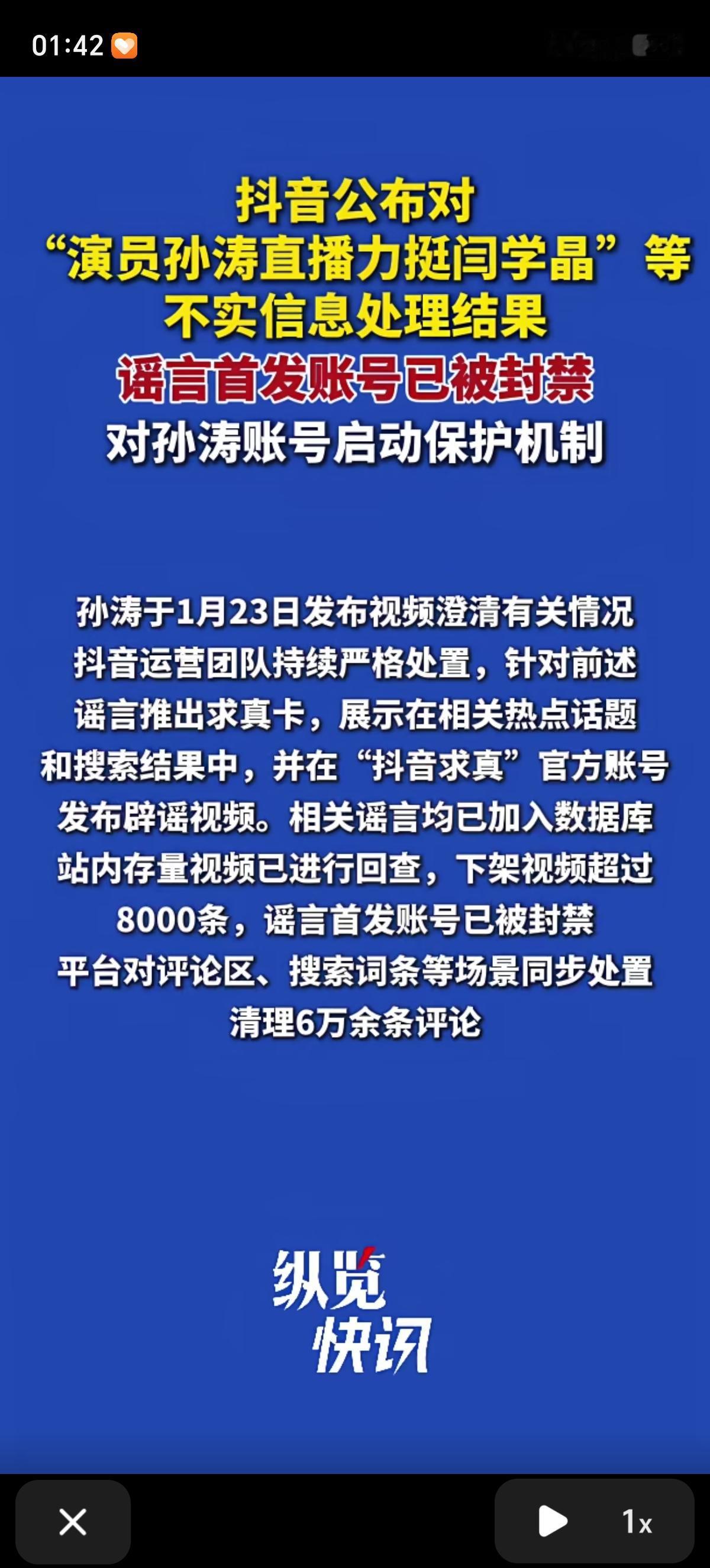 孙涛含泪发了一个23分钟多的视频表示自己没有说过力挺闫学晶的话。已经得到了抖音对他的保护,不实言论的账号被封了。 近期,有营销号恶意编造了“演员孙涛在直播中力挺闫学晶”“孙涛直播间卖杂粮”“发布致歉信”等不实信息。这些谣言在网络上快速传播,给孙涛本人及其家人造成了极大困扰。 1月23日,孙涛发布了一条23分钟的长视频含泪辟谣。他明确表示,自己在1月2日的直播中全程未提及闫学晶相关话题,所有传言都是凭空捏造的。他还提到,就连相交30多年的老战友都信以为真,这让他意识到谣言的严重性。 抖音为了保护孙涛,把相关不实视频超过8000条,清理了6万余条恶意评论。 正义不会迟到,我们要有自己的判断力,不要人云亦云,看个热闹就好了,不要被牵着鼻子走,不要被带节奏。支持孙涛维权。