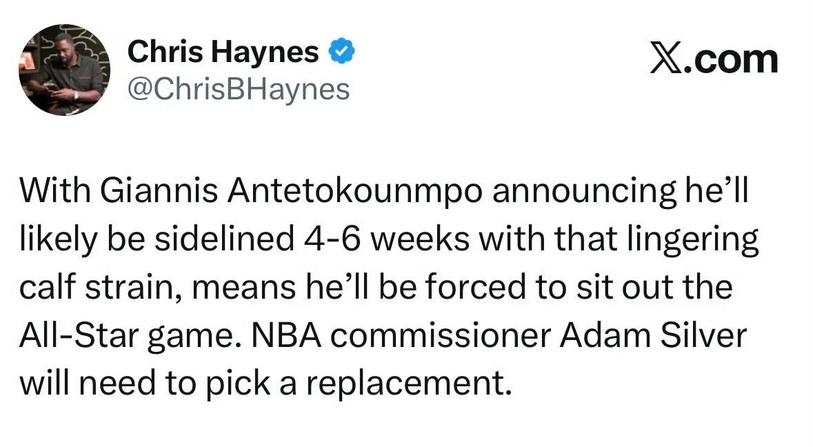 扬尼斯·阿德托昆博宣布,因小腿旧伤复发,他将缺席4-6周,这意味着他将无法参加本届全明星赛,NBA总裁亚当·萧华需要挑选一名替代者。 扬尼斯的缺席打破了他连续7年入选全明星的参赛纪录,这是他职业生涯首次因伤错过全明星正赛。 根据NBA规则,全明星的替补人选由总裁萧华在同赛区的球员中选择,通常会优先考虑战绩靠前球队的球员或人气较高的遗珠。