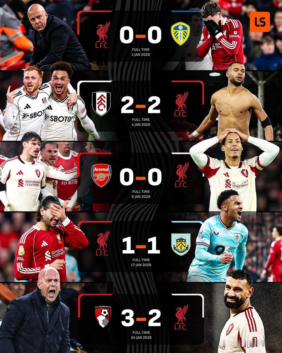 利物浦又一次被读秒绝杀,自从进入到2026年以来,利物浦已经遭遇英超五轮不胜! ❌ 2-3 伯恩茅斯 ➖ 1-1 伯恩利 ➖ 0-0 阿森纳 ➖ 2-2 富勒姆 ➖ 0-0 利兹联 斯洛特一直说,球队不胜不是因为比赛场面不行,而是运气不行。可是,连续不胜是运气的问题吗?斯洛特就没考虑下自己的问题? 现在的利物浦球迷,恐怕呼声最多的两件事是:斯洛特下课与阿隆索上课吧!