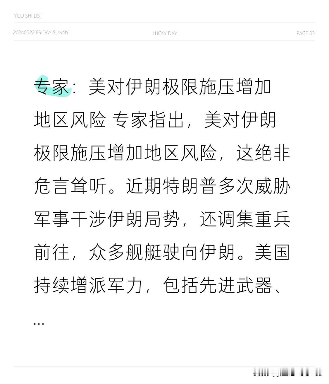 专家:美对伊朗极限施压增加地区风险 专家指出,美对伊朗极限施压增加地区风险,这绝非危言耸听。近期特朗普多次威胁军事干涉伊朗局势,还调集重兵前往,众多舰艇驶向伊朗。美国持续增派军力,包括先进武器、航母战斗群等,其盟友以色列也完善防空能力,各方都没排除采取强硬军事行动的可能。 而伊朗也没坐以待毙,开展代号“力量”的军演,范围从纳坦兹铀浓缩厂扩大到另两处核设施。在美候任总统特朗普即将再次上台、与以色列加紧行动的背景下,伊朗军演是对美国极限施压的回应。如此一来,中东地区的火药味越来越浓,安全风险进一步增加。