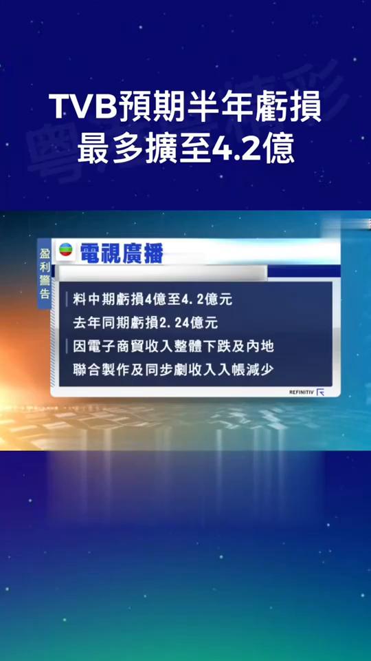TVB预期半年亏损最多扩至4.2亿。 电视广播发盈利警告,预计截至六月底中期亏损4亿至4.2亿元,去年同期亏损2.24亿元。集团预期内广告收入有所增长,不过随着消费者在疫情之后回复以往较为传统的消费习惯,集团的电子商贸营商环境变得较为不利于经营。 期内电子商贸收入整体下跌,加上内地联合制作及同步剧播放安排偏重于下半年,期内收入入账亦都减少。