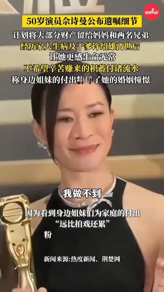 50岁演员佘诗曼公布遗嘱细节,计划将大部分财产留给妈妈和两名兄弟。 热度新闻。 经历家人生病及干爹许绍雄离世后,让她更感生命无常,不希望辛苦赚来的积蓄付诸流水,称身边姐妹的付出粉碎了她的婚姻憧憬。 近日演员佘诗曼受访时谈到,若能回到20年前或许会选择结婚生子,但如今心态已然转变。 生小朋友?我想我不会了。 因为看到身边姐妹们为家庭的付出,早就立遗嘱了。 远比拍戏还累,粉碎了她对婚姻的憧憬。 我赚钱如此辛苦,如果我有事发生的时候,不要浪费我的毕生积蓄。 她不希望辛苦赚来的积蓄付诸流水,因此已立好遗嘱计划将大部分财产留给她妈妈和两名兄弟。