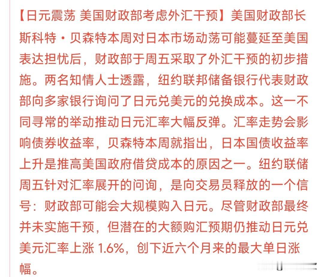 美有意干预日本汇率,以达到降低美国借贷成本 现在虽然没有明确的宣布会购入大量日元,但是本特森已经针对担忧初步采取了措施,但是市场认为如果美国借贷陈本还是高居不下,那么买入日元就会成真。 汇率市场最先反应,周五日元兑美元汇率直接暴涨了1.72%,直接停止了日元下跌的脚步,这就是市场对于日元的预期。 目前日本经济也靠日元的贬值在刺激,如果日元贬值的趋势停止,对于日本的经济将会受到影响,而美国如果出手干预,对于日本来说就是一场必输的博弈。