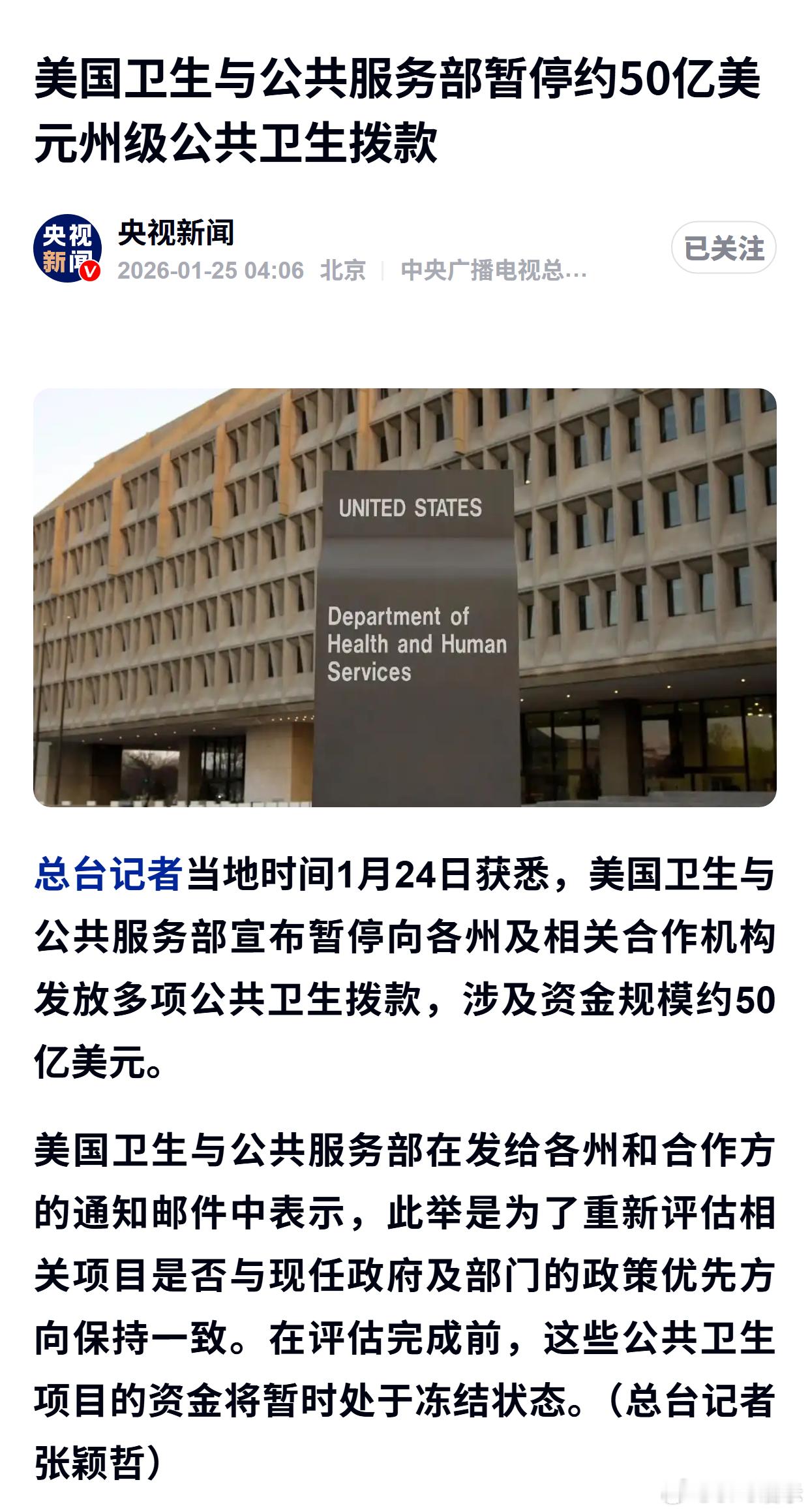美国卫生与公共服务部暂停约50亿美元州级公共卫生拨款