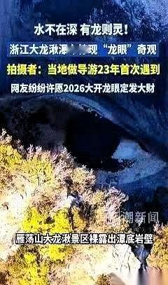 一个在浙江雁荡山干了23年的女导游,带团走到大龙湫瀑布底下,习惯性地往下一扫。 当即愣在原地,游客们还在一旁拍照说笑,没人留意往日深不见底的潭水已经退去,潭底竟现出一只模样逼真的巨型“龙眼”,正对着天空,一眼看去格外震撼。 她没多言语,默默掏出无人机升空拍摄,当画面传回手机的那一刻,周围瞬间安静下来。大家都看清了,浅色岩石自然形成了眼白,潭心那汪不动的深绿水洼就是瞳孔,岩壁上还有一道天然褶皱,恰巧成了双眼皮,这天然形成的“龙眼”,就嵌在山谷间,模样生动又特别。 她坦言这是第一次见这般景象,突然觉得熟悉的山,藏着不为人知的美好。视频传到网上后,引来不少网友关注,有人翻出当地老一辈的传说,说潭底压着恶龙,天旱水退就会露出眼睛;也有人觉得这是祥瑞之象,见者会有好运,评论区里满是大家许愿求顺的留言。 其实这哪里是什么神怪之说,不过是大自然的鬼斧神工,藏了千百年的美景,借着干旱的天时才得以显露。只是这份美好十分短暂,它是天时造就的偶然,等一场大雨过后,潭水涨满,这只“龙眼”就会再次被掩藏,回归山谷的静谧。 山水间从不少这样的惊喜,只是大多藏在不为人知的地方,等着偶然的机会被发现。这世间的美好,往往都带着这样的不经意,让人忍不住感慨大自然的神奇。