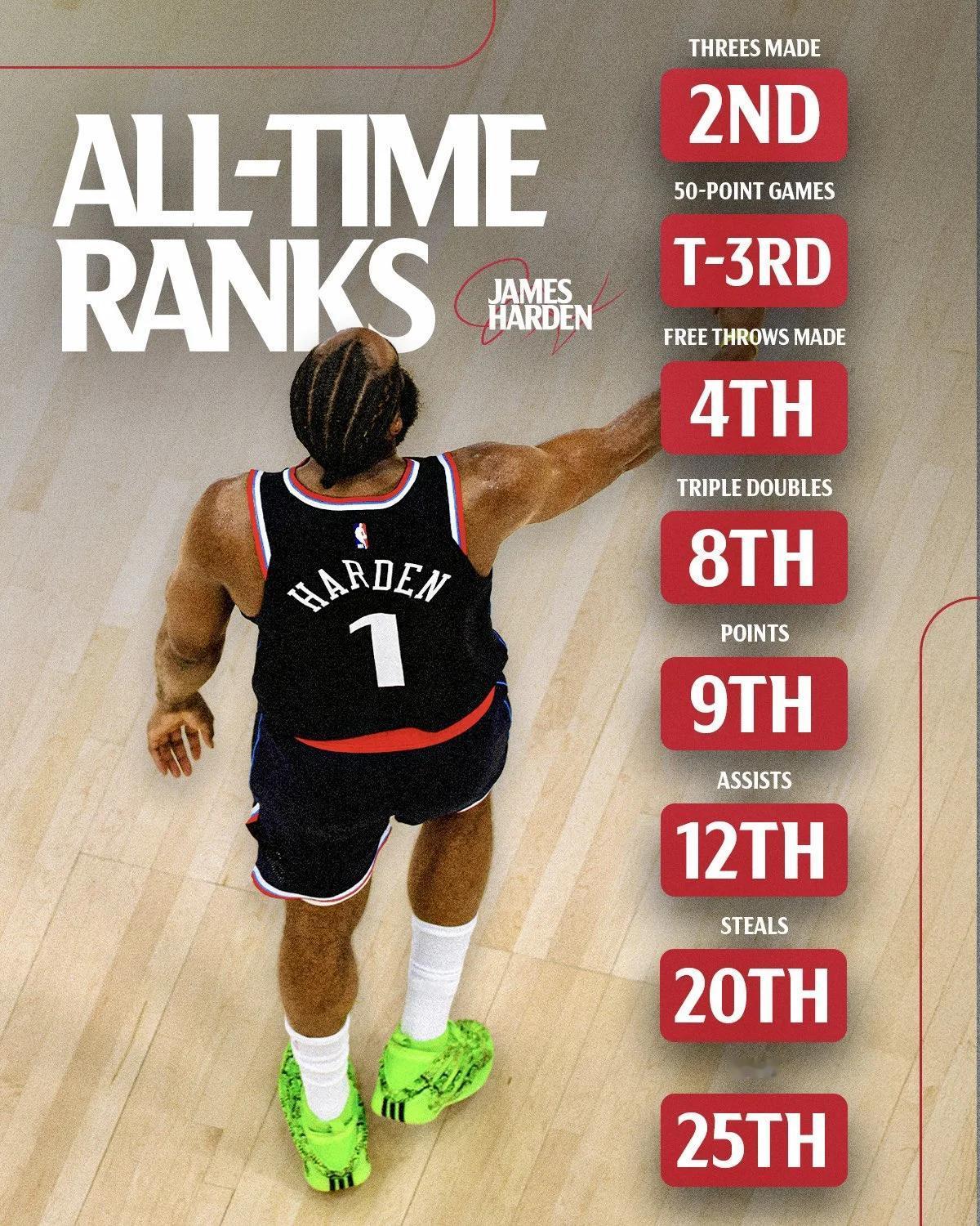 刚看到关于哈登的一些数据的历史排名,有三分命中数历史第二,也有50分场次历史第三,不得不说,哈登的个人数据这方面,确实厉害,能投能突又能传,而且场均上场时间还长,然后出勤率也很高…… 不敢想如果哈登一直在火箭的话能打破多少纪录,后来去篮网去76人,折腾了一圈,才总算又在快船安稳下来了,选择球队和职业规划这方面,哈登确实少了些运气