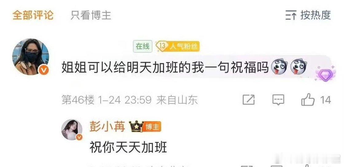 粉丝问彭小苒能不能给加班的自己送一句祝福彭小苒:祝你天天加班啊啊啊美女小嘴跟淬了毒一样