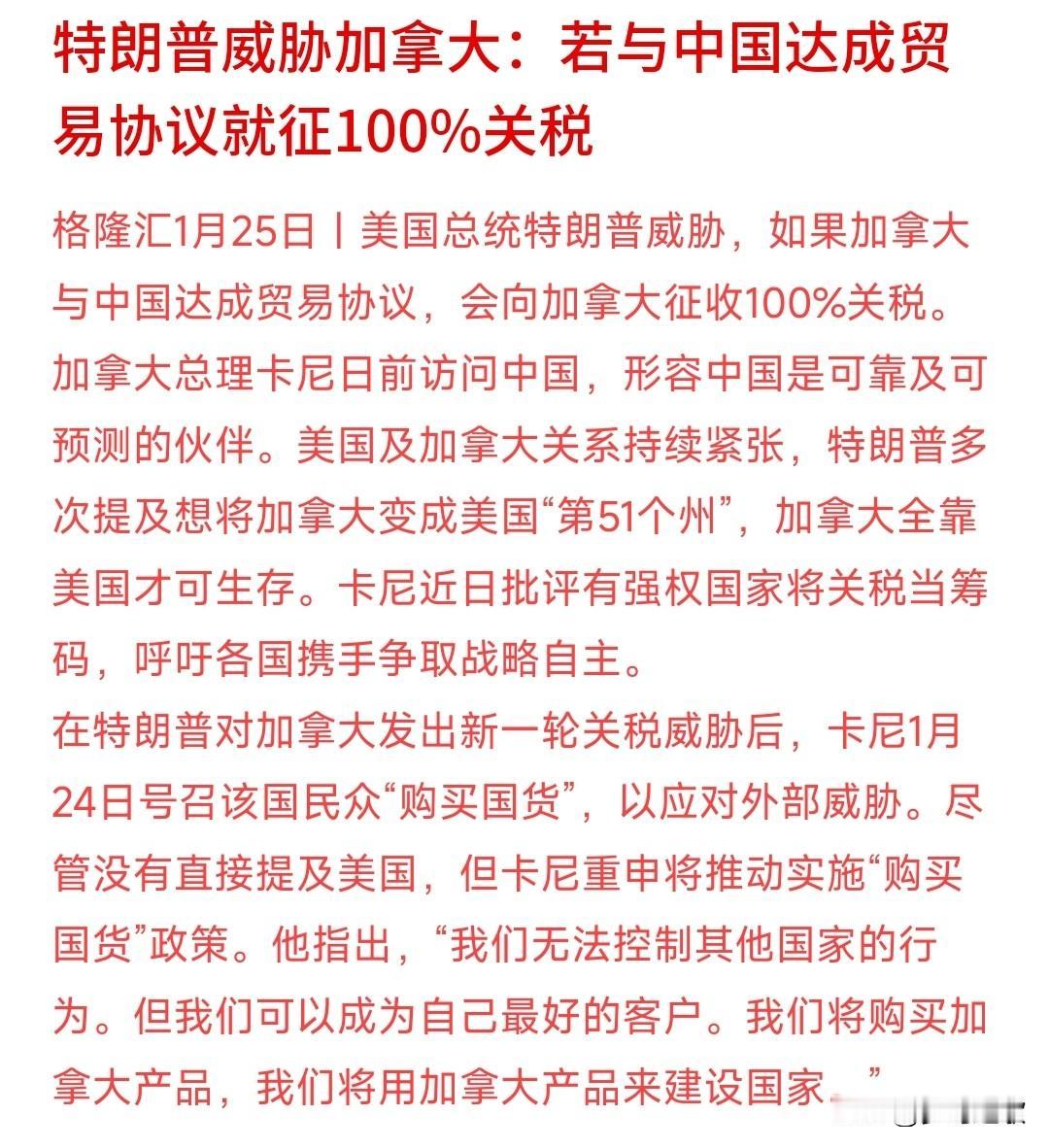 中加贸易如果达成,特朗普威胁要给加拿大加征100%关税 特朗普这是自己不能自由贸易,别的国家也别想好过,中加本来达成贸易: 1.加方对中国电动车设4.9万辆/年配额,配额内关税从100%降至6.1%; 2.中方3月前将加拿大油菜籽综合税率由85%降至约15%,重启农产品贸易 这本来就是中加双方的事情,特朗普为了不让中加做生意,就用关税威胁加拿大。 因为特朗普一直想把加拿大变成美国的“第51个州”,如果中加贸易达成,经济上就能摆脱美国的控制,就离特朗普的目标越来越远了 所以才会威胁不让中加达成贸易 不过从现在卡尼的态度看,中加之间的贸易还是很可能达成的,特朗普可能要抓狂了。