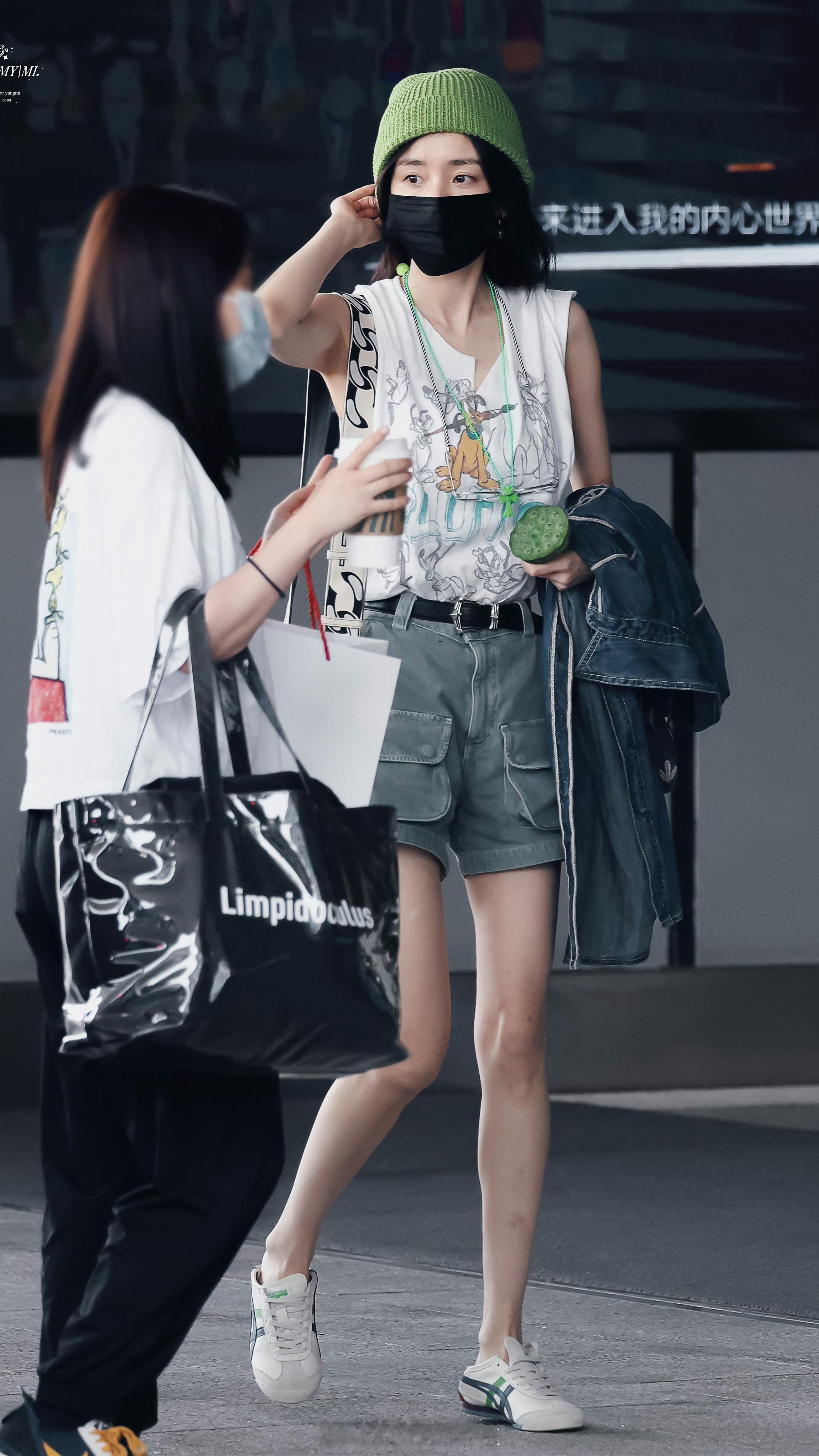 杨幂素颜机场多巴胺穿搭