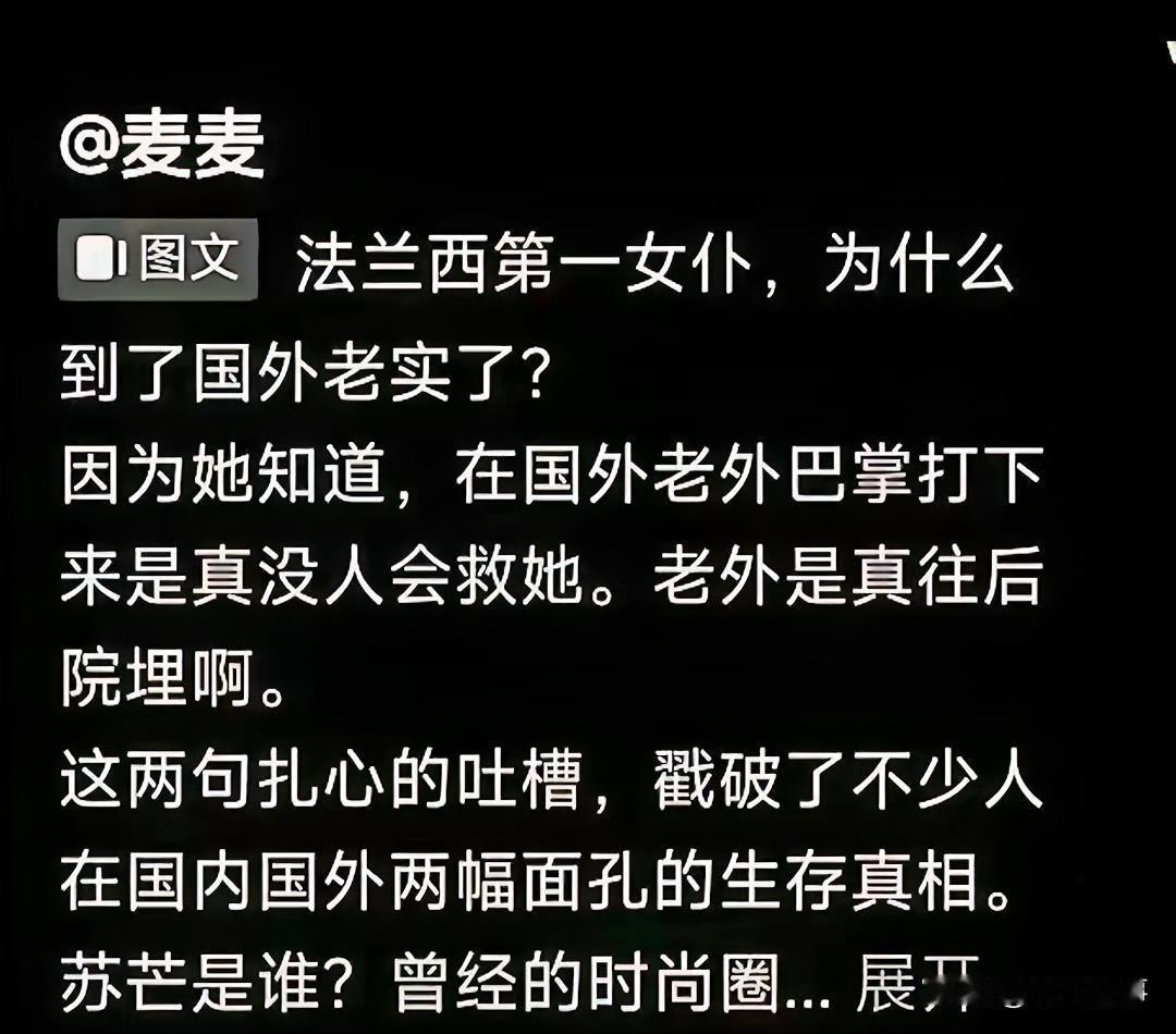 苏芒: 以前请叫我小公主,现在请叫我法兰西厨娘。 在国内是妥妥人生大赢家,娇滴滴的小公主,高高在上,吃穿用度都是顶级最好的。 现在嫁到法兰西,摇身一变成为一名合格的厨娘,每天醒来就要给15个家人准备餐食。 以前十指不沾阳春水的小公主,也开始了蜕变之路,这可能就是中西方文化的差异。 不得不说公主病还得是西药医,异国他乡可没人在惯着你。 大家对此有什么看法?欢迎评论区留言。