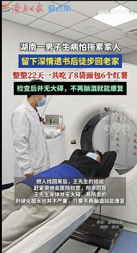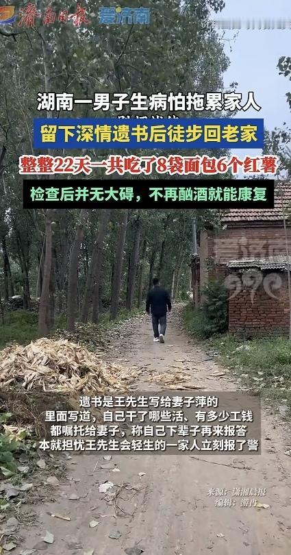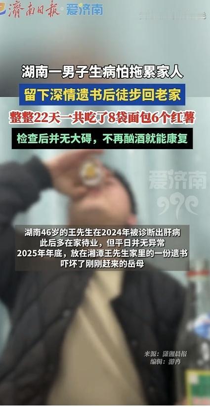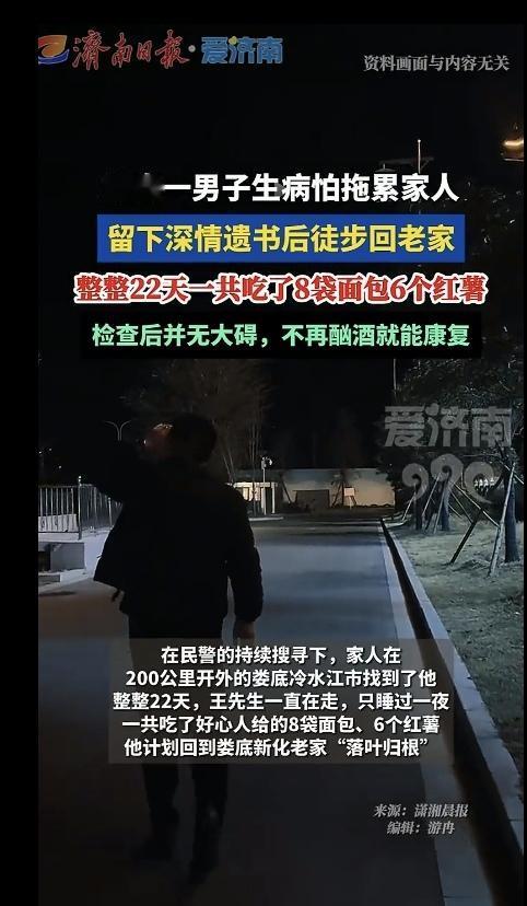 今天看到这个新闻,看得我鼻子酸酸的,真的是只考虑家人,完全不考虑自己的身体,好在结局是好的! 湖南一位46岁的王先生,2024年查出肝病,此后心情不佳,一直没有心情,因此,大多时间就在家待业。 2025年年底,为了不拖累家人的负担,他悄悄地写下了一封给妻子的遗书,就踏上了徒步回娄底新化老家的路,打算在那里落叶归根。 在他的的遗书里,他写着自己干过的活、攒下的工钱,还嘱托妻子好好生活,说自己下辈子再来报答。 尤其是这段对妻子的深情告白,真的让人看哭了,这段告白是这样的:“深爱的萍,我王安顺这辈子到这里就算完了,辜负了你对我的爱,下辈子再来报答……” 看得出来,他很爱妻子,也怕给妻子带来负担。 后来,家人发现遗书后很是担心他,立刻报了警,最终,在民警持续的搜寻下,家人在娄底冷水江市找到了他。 找到他时,已经过了整整22天,他走了200多公里,只睡过一次安稳觉,全靠好心人给的8袋面包和6个红薯撑着。 万幸的是,送医检查后发现他的肝硬化腹水并不严重,只要不再酗酒就能康复。 网友们看完后也红了眼眶:“他走的哪里是路,是一个男人最后的尊严和温柔。” 也有的网友说:“8袋面包6个红薯,22天,就吃了这么点东西,而且,他还身患疾病,想想都心疼。” 还有的网友说:“最怕这种为了家人默默扛下一切的男人,太让人心疼了。” 通过这件事也让我明白,家人之间最珍贵的是有困难一起面对,而不是一个人默默承受,如果一个人默默抗,这看似是为家人考虑,其实,是自私的表现。 很多时候,我们总以为自己是在为家人着想,却忽略了家人最怕的不是一起克服困难,而是失去我们。 所以说,遇到困难不要硬抗,要知道在你的背后,还有你的亲人一直在支持你。 话说,如果你遇到困难时,你会选择独自硬扛,还是第一时间告诉家人?