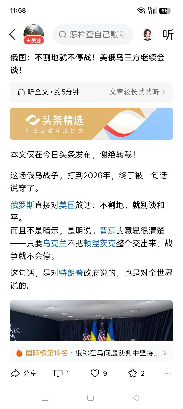 谈也白谈! 俄罗斯好像坚定不移的说,如果乌克兰不割让顿巴斯地区,就谈不到和平。 乌克兰也宁死不屈的说,割让土地没有任何可能性,宁愿继续打下去。 这似乎就是俄罗斯与乌克兰目前继续战争的最根本原因。可是,谁又能解决了他们现在的争议呢?遍寻全世界所有的人,看不到有这样的人物,估计在可预见的未来,好像也不可能出现这样的人物,或许还可以再加上不可能出现那样一边倒的局势。 两虎相争,进入对方的那只虎不退回自己的领地,让领地受到侵犯的老虎让出领地,可能性微乎其微。 这都是些最基本的事情,并不复杂。但凡有一点正常逻辑思维的人,估计都心知肚明,一清二楚。