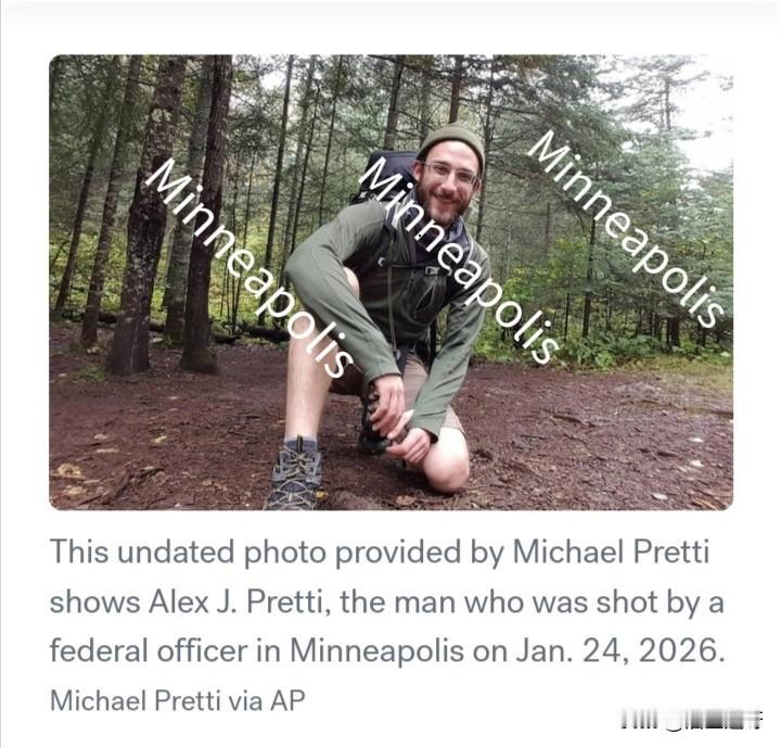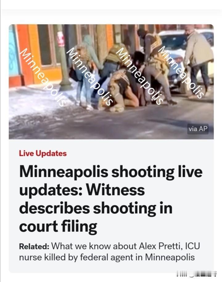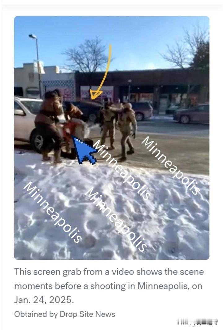 美国明尼苏达州明尼阿波利斯,又发生一起ICE当街枪杀事件,被枪杀者:37岁,白人男性,叫Alex Pretti,美国公民,在军医院当护士。 事件:图2中蓝色箭头所指背着橘色背包的女性抗议者在与ICE理论的过程中被ICE推搡,Alex上前阻止ICE,并想扶起该女性,被ICE喷辣椒雾后倒地,后被一群ICE围攻按倒在地,枪声响起,Alex身中四到五枪,送医无效死亡。 ICE枪杀Alex的理由:Alex持有枪支。但警方已核实,Alex合法持枪。且,事件发生的整个过程,Alex没有拔枪的企图,一直都是边拍视频,边和ICE交谈,图3。 图2黄色箭头所指是ICE向Alex喷辣椒雾。 这是继前不久ICE当街枪杀蕾尼.古德女士后又发生的一起ICE枪杀公民事件。 明尼苏达州暴力抗议活动升级